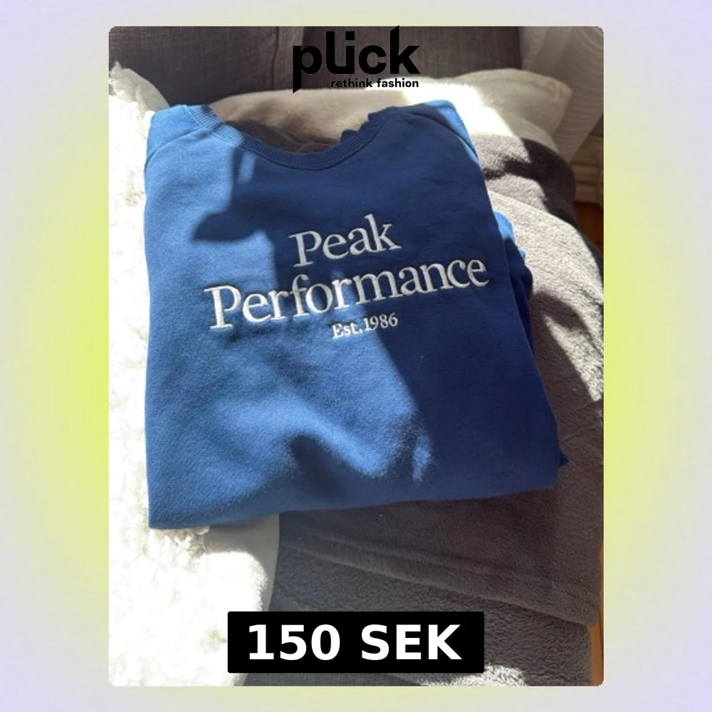 Snygg blå sweatshirt från Peak Performance med vit broderad logga och texten 'Est. 1986' på bröstet. Tröjan har rund halsringning, ribbade muddar vid ärmslut och nederkant. Perfekt för en avslappnad och sportig stil.