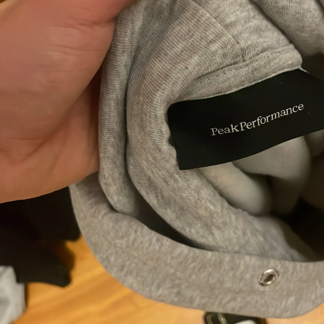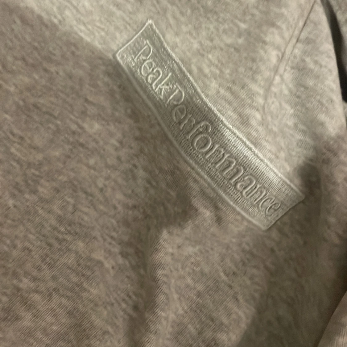 Snygg grå hoodie från Peak Performance med broderad logga på bröstet. Klassisk modell med huva och känguruficka framtill. Mjuk och skön i bomullsblandning, perfekt för chill eller skola.