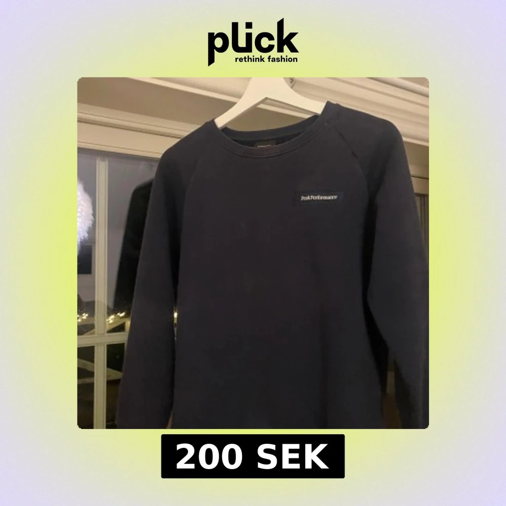 Säljer en mörkblå tröja från Peak Performance. Tröjan har en enkel design med rund hals och långärmade ärmar.