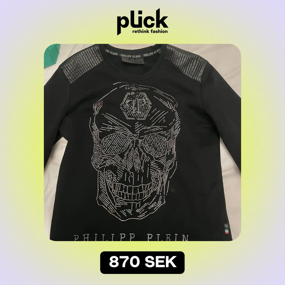 Säljer en svart tröja från Philipp Plein med en stor, glittrig dödskalle på framsidan. Tröjan är köpt från johnells för några år sedan, påse till kommer inte kvitto
