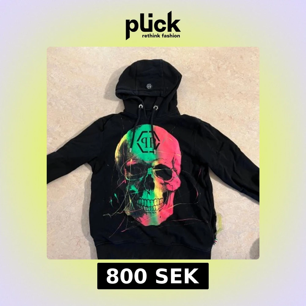 Svart hoodie från Philipp Plein med stor färgglad dödskalle i grönt, gult och rosa på framsidan. Tröjan har huva med snörning och metallogo på huvan. Tillverkad i mjuk bomull, perfekt för dig som vill sticka ut. Priset går att diskutera vid snabb affär. Skriv vid frågar så svarar jag.