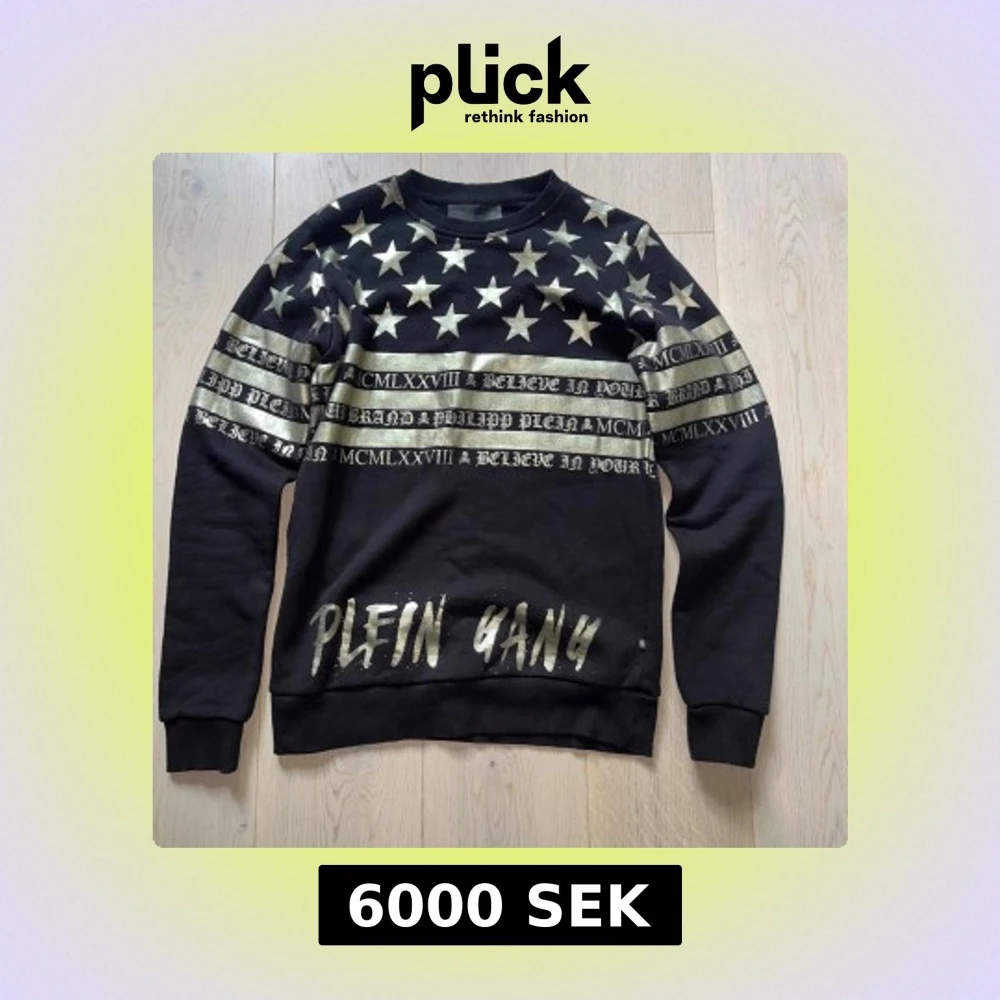 Svart sweatshirt från Philipp Plein med guldiga stjärnor och textdetaljer över hela tröjan. Snyggt tryck med "PLEIN GANG" framtill och romerska siffror. Mjuk bomull, rund hals och långa ärmar. Perfekt för dig som gillar statement-plagg. Har tappat emblem där bak!