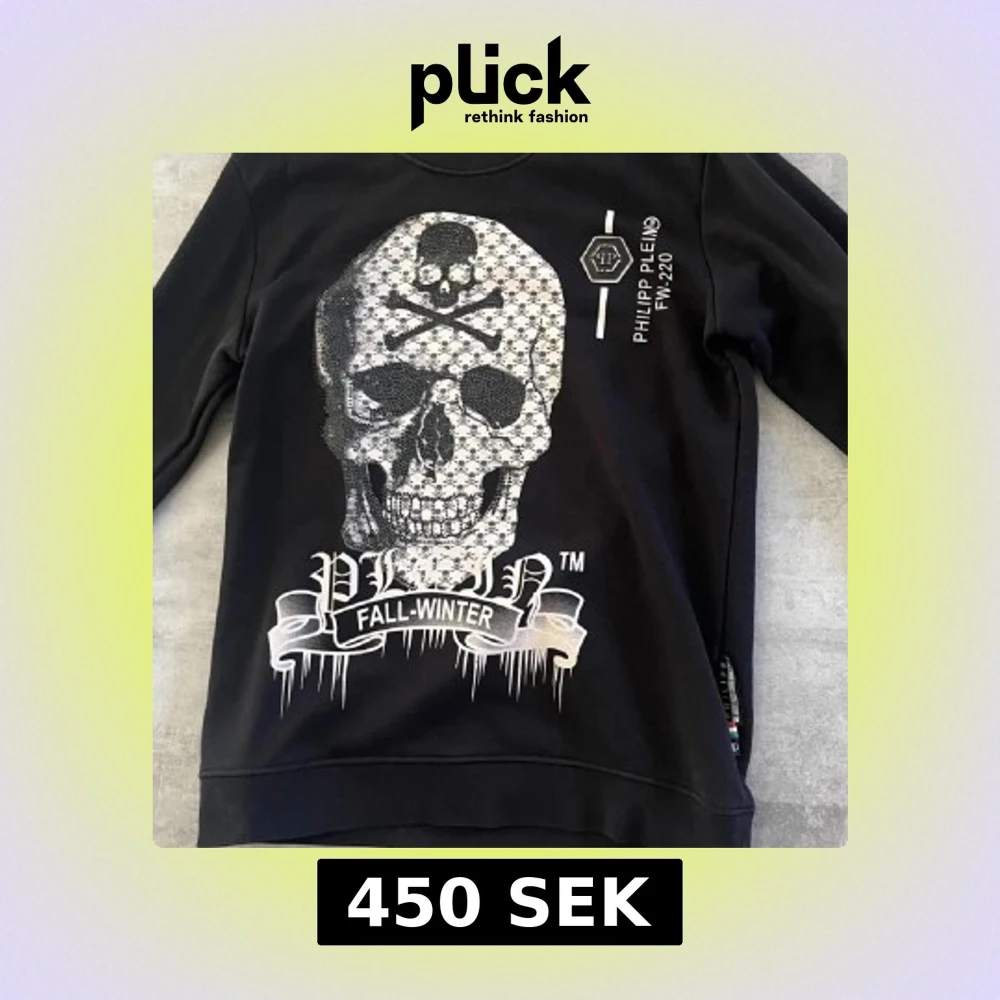 Cool svart sweatshirt från Philipp Plein med stor vit dödskalle och texten 'FALL-WINTER' framtill. Tröjan har långa ärmar och tryckdetaljer på bröstet. Perfekt för dig som gillar streetwear och vill sticka ut.