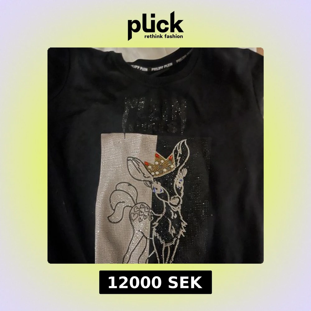 Säljer en svart limited edition tröja från Philipp Plein girls med ett glittrigt Bambi-motiv framtill. Designen är dekorerad med diamanter, samt en krona i guld och rött på Bambi. Perfekt för dig som gillar något helt eget bli den första i Sverige 😊nypris var 25.000kr förra vintern