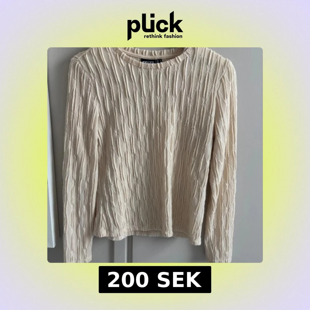 Säljer en beige långärmad tröja från Pieces med ribbad struktur och diskret mönster.