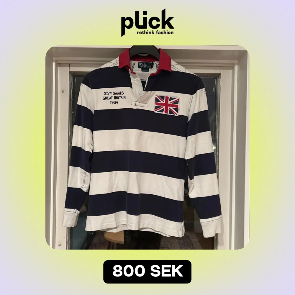 Säljer en snygg randig pikétröja från Polo Ralph Lauren i marinblått och vitt. Tröjan har en röd krage och broderad Union Jack-flagga på bröstet. Den är i bra skick, då jag inte har använt den så mycket.