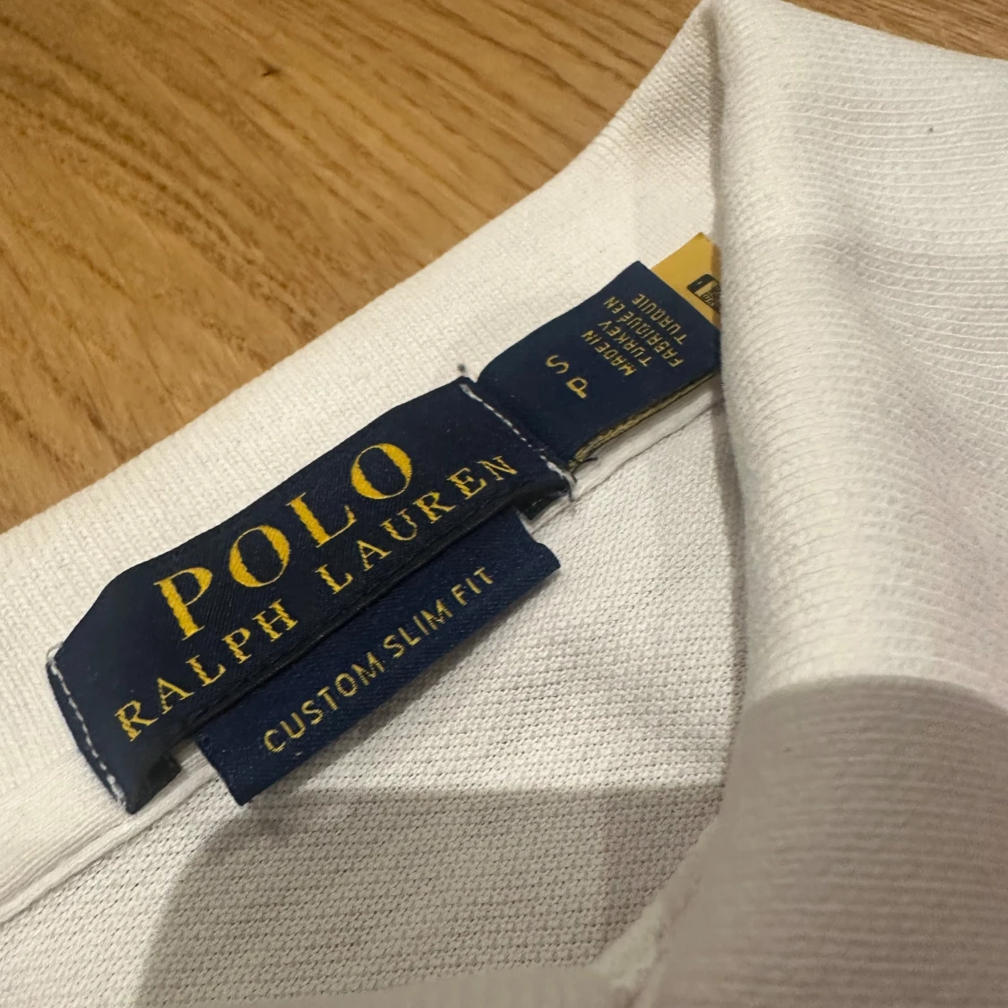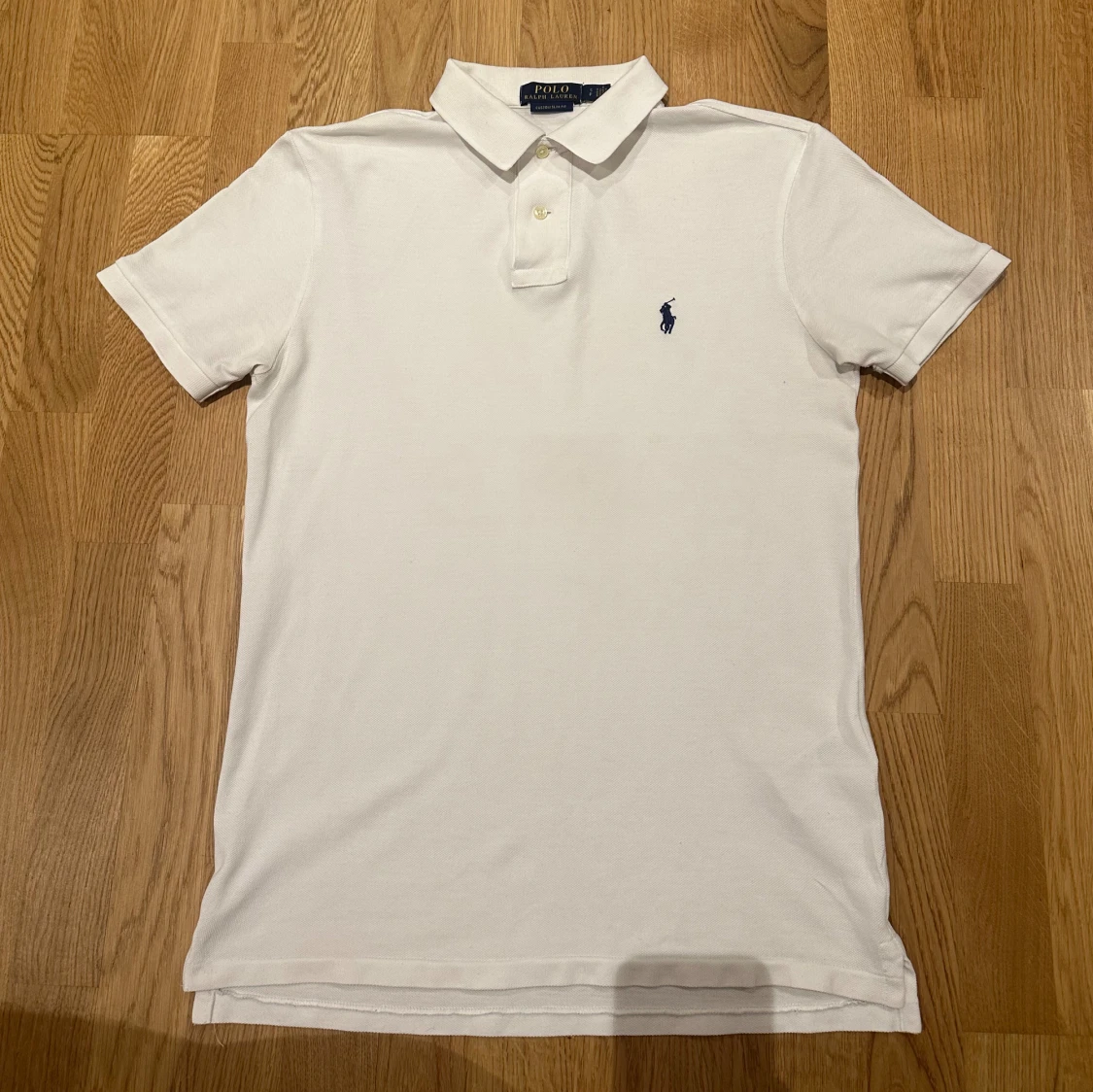 Klassisk vit pikétröja från Polo Ralph Lauren i custom slim fit. Tröjan har korta ärmar, krage med två knappar och den ikoniska broderade loggan i mörkblått på bröstet. Perfekt för en clean och stilren look.