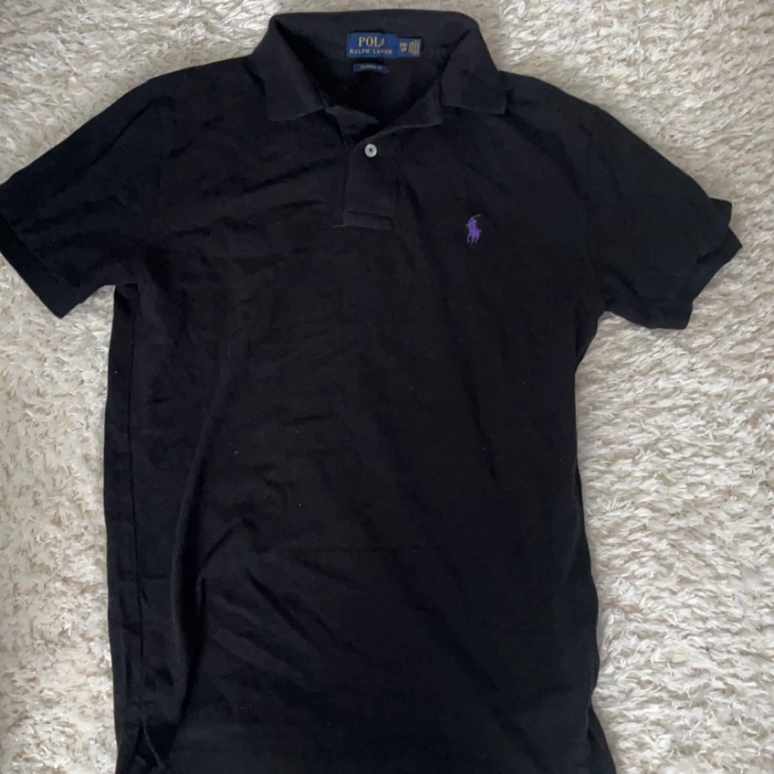 Svart Polo Ralph lauren piké med lila märke vilket är ganska ovanligt. Säljer den eftersom den är för liten, strl är xs men funkar 100% som S