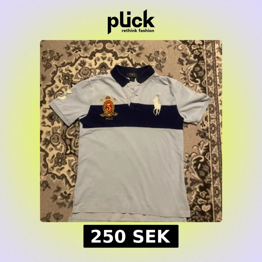 Säljer en ljusblå pikétröja från Polo Ralph Lauren med mörkblå krage och bred rand över bröstet. Tröjan har broderad logga och emblem med siffran 3 på bröstet. Klassisk piké med korta ärmar och knappar vid halsen. Bara att höra av sig vid funderingar!