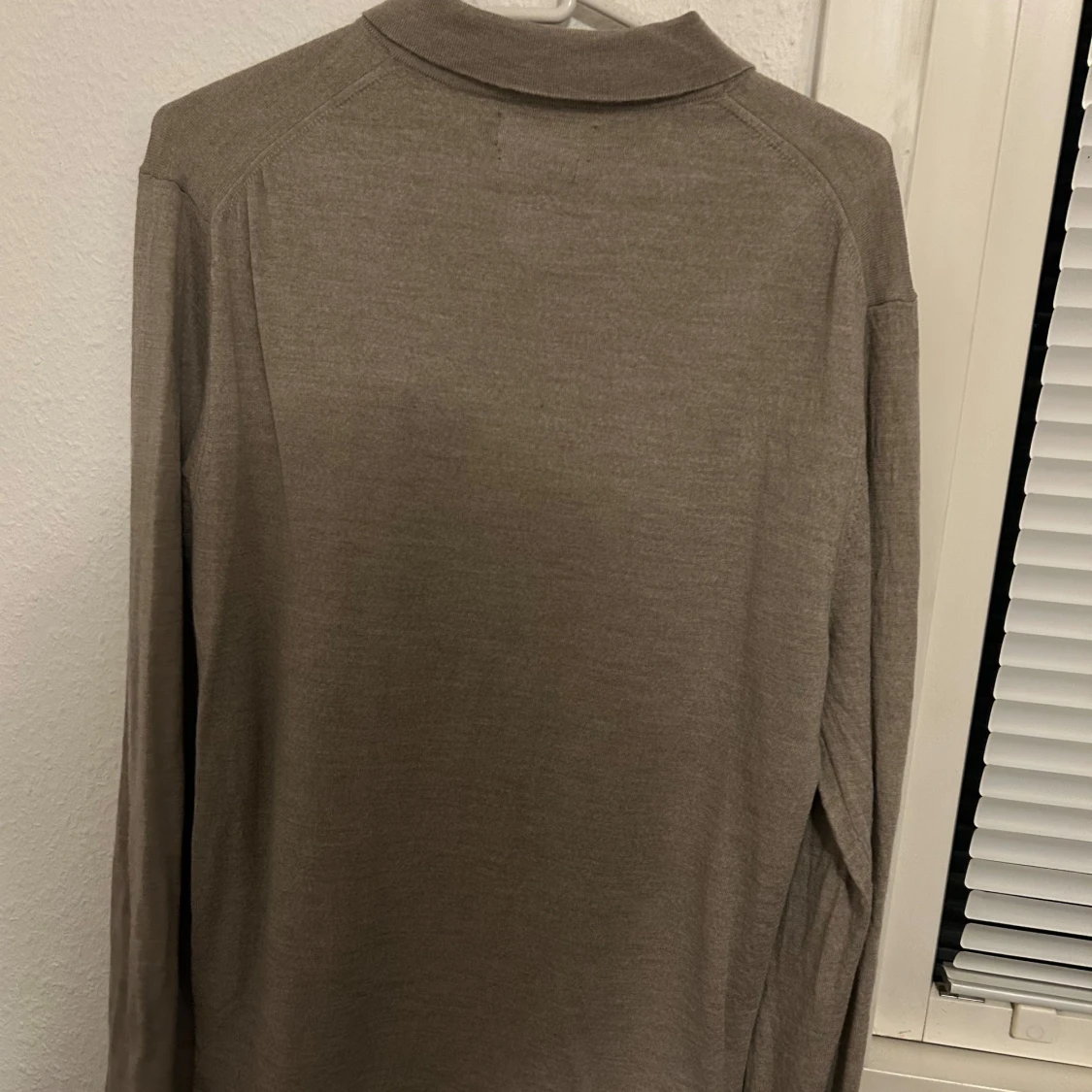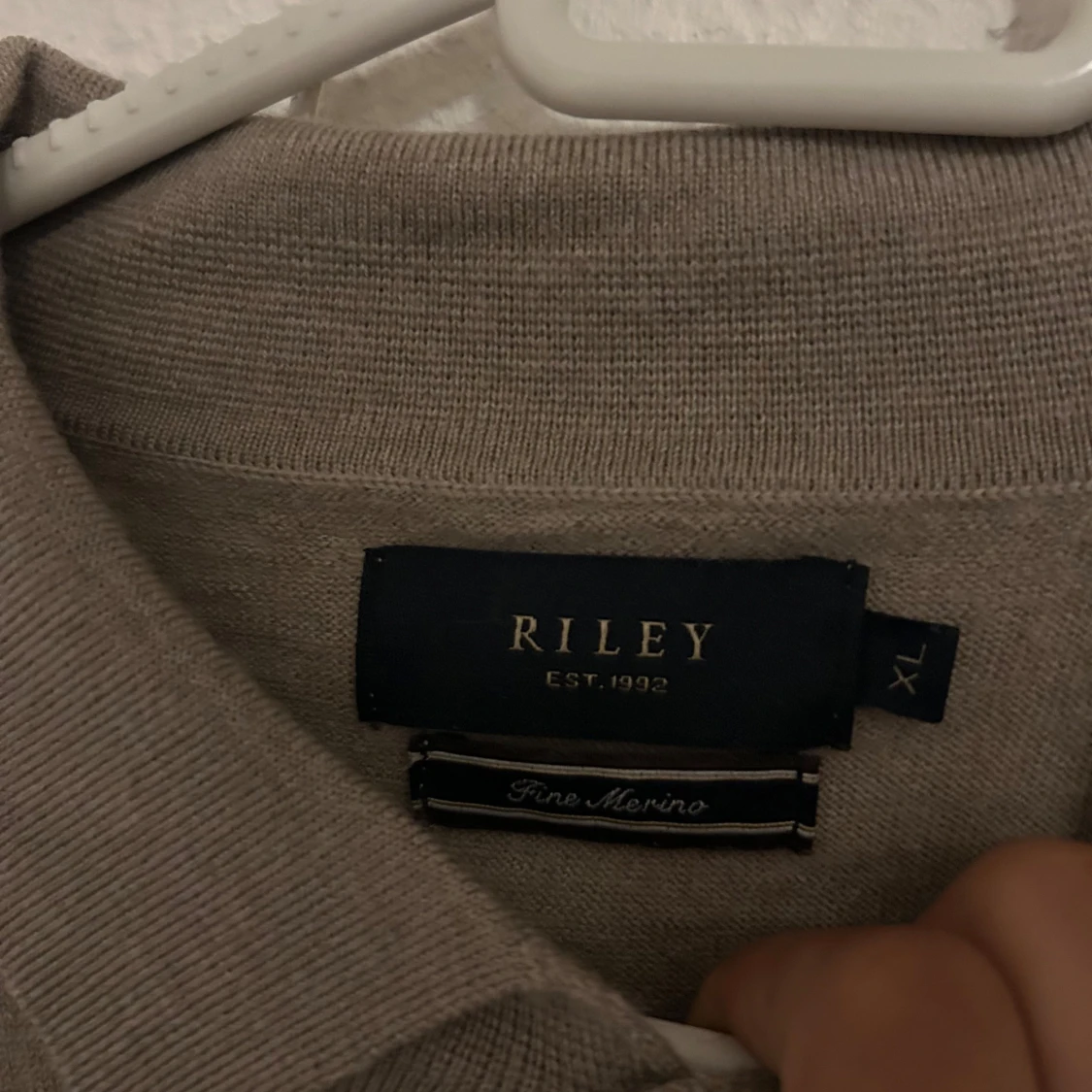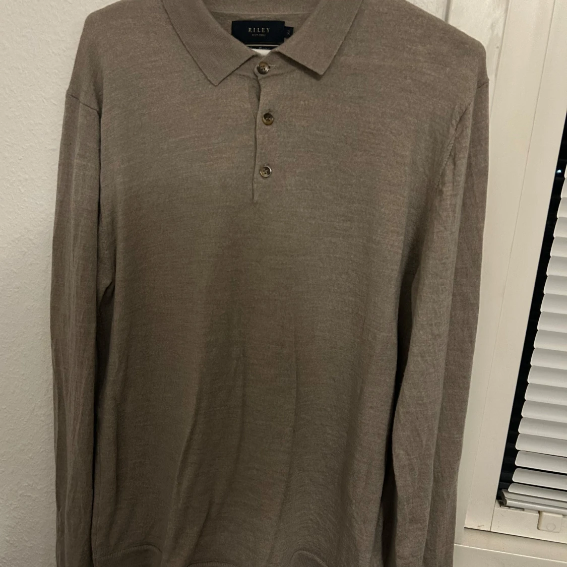 Säljer en stilren beige långärmad pikétröja från Riley i fin merinoull. Tröjan har en klassisk krage med tre knappar framtill. Perfekt för en elegant och avslappnad look.