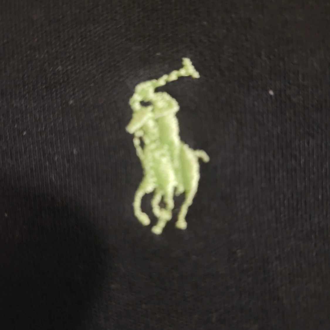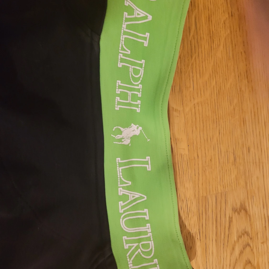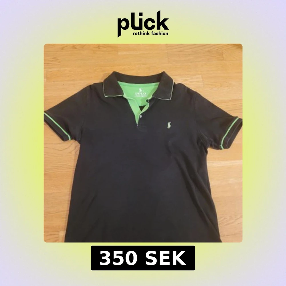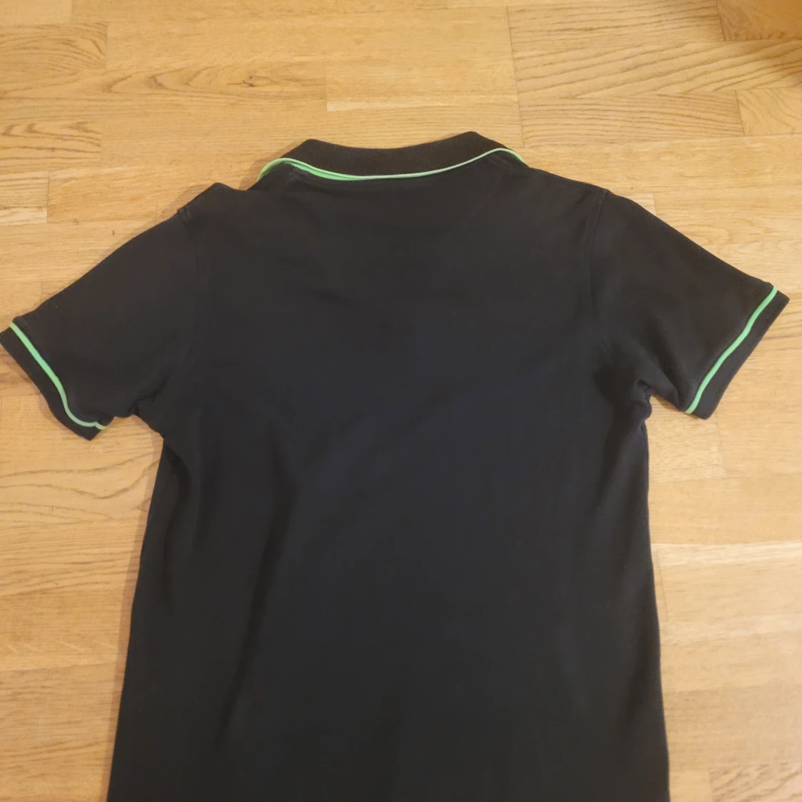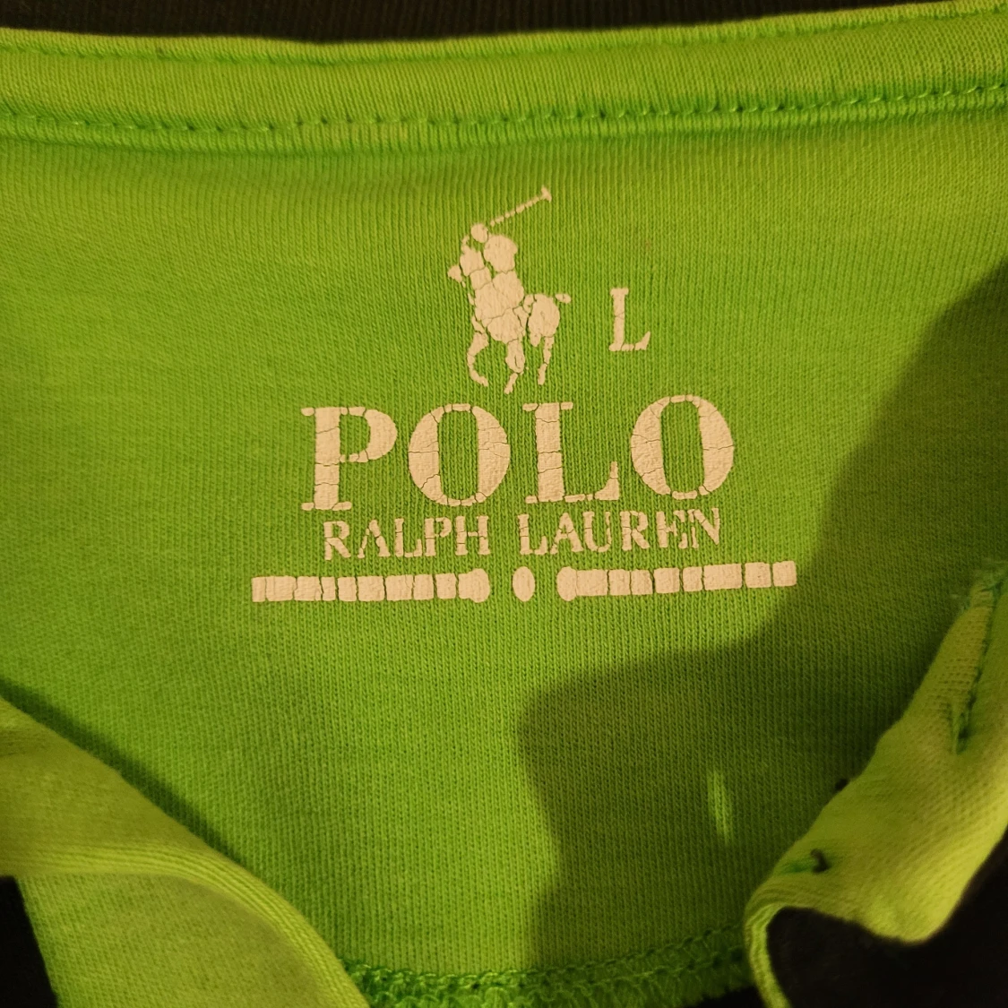 Snygg svart pikétröja från Ralph Lauren med gröna detaljer. Tröjan har en klassisk krage och korta ärmar med gröna kanter. En unik Pikétröja. Storlek L i barn storlek.