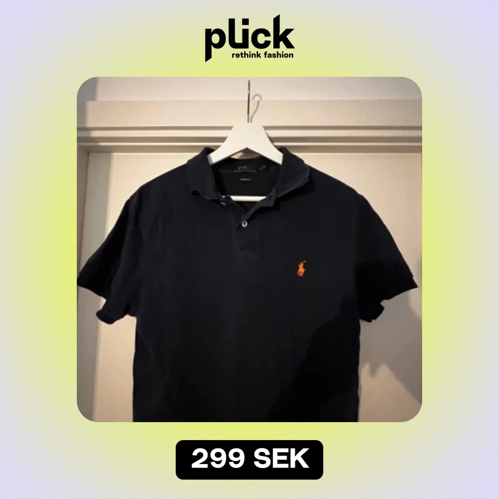 Säljer en klassisk svart pikétröja från Ralph Lauren i storlek M. Tröjan har en snygg orange logga på bröstet och är i custom fit. Perfekt för både vardag och fest!