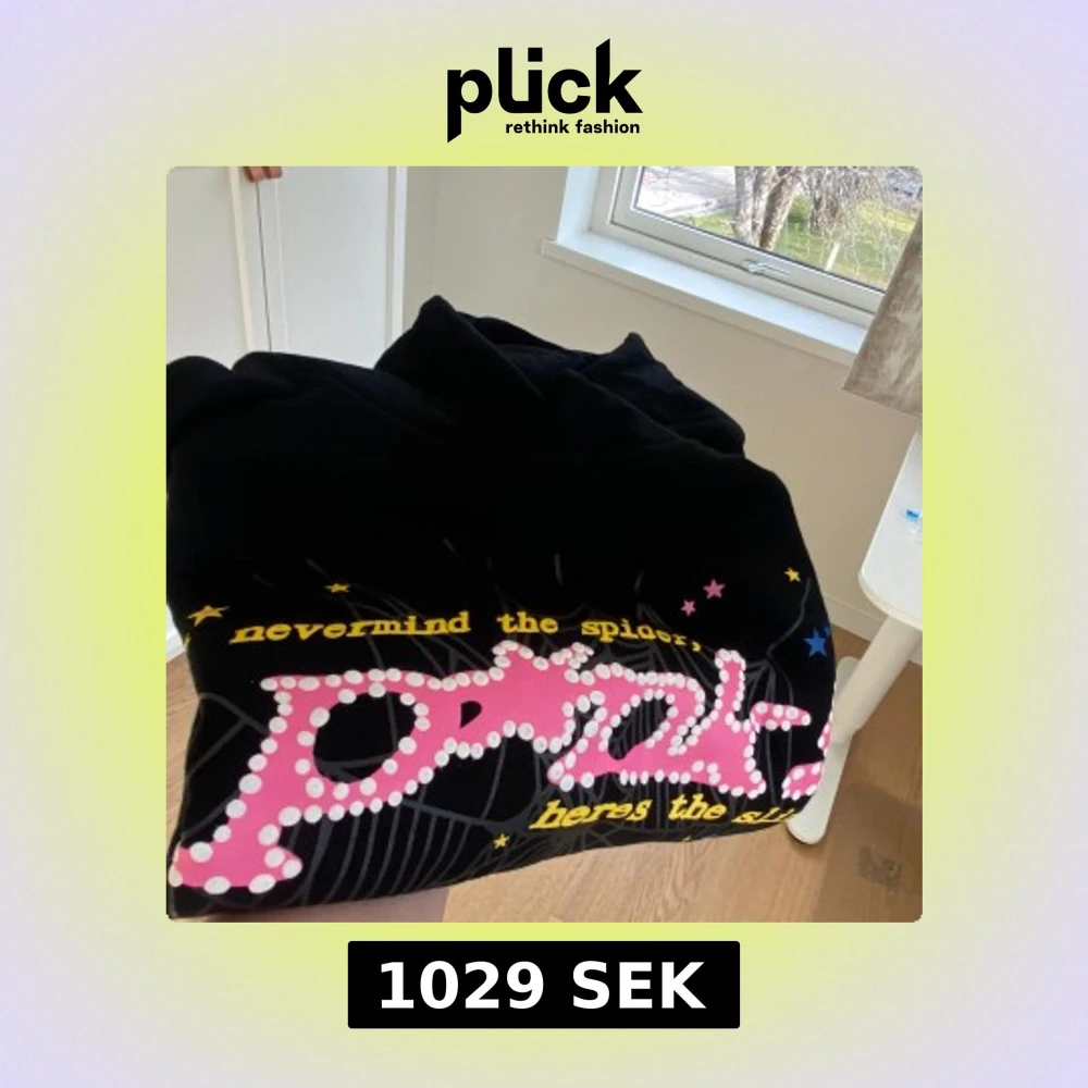 Cool svart hoodie med färgglad text och spindelnätsmönster. Texten är i rosa och gult med stjärnor i olika färger. Perfekt för en avslappnad stil.