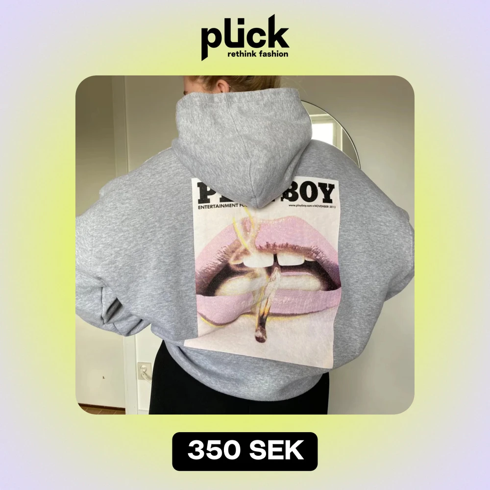 Säljer en grå hoodie med stort Playboy-tryck på ryggen. Hoodien är i bra skick och har en skön passform. Använd fåtal gånger. 🩷