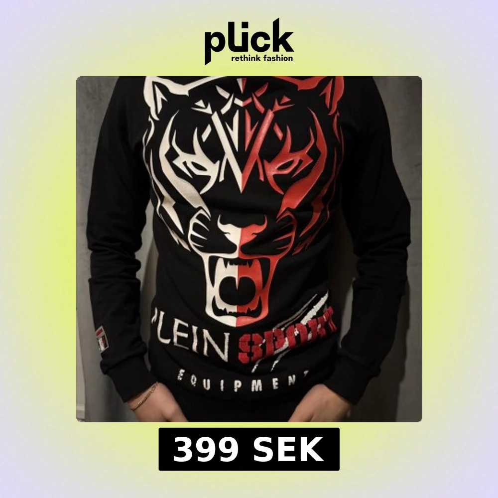 Snygg svart långärmad tröja från Phillip pleins sport kollektion (plein Sport) med ett stort tigertryck i vitt och rött på framsidan. Trycket på ryggen har försvunnit lite i tvätten men annars i bra skick. Otroligt snygg och ovanlig tröja Ord pris ca 2500kr