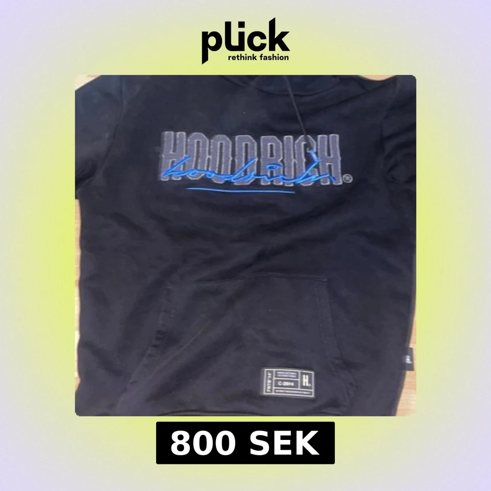 Svart hoodie från Hoodrich med stort grått och blått tryck på bröstet. Klassisk känguruficka framtill, huva med snörning och en liten etikett nertill. Perfekt för en chill och street-inspirerad stil.