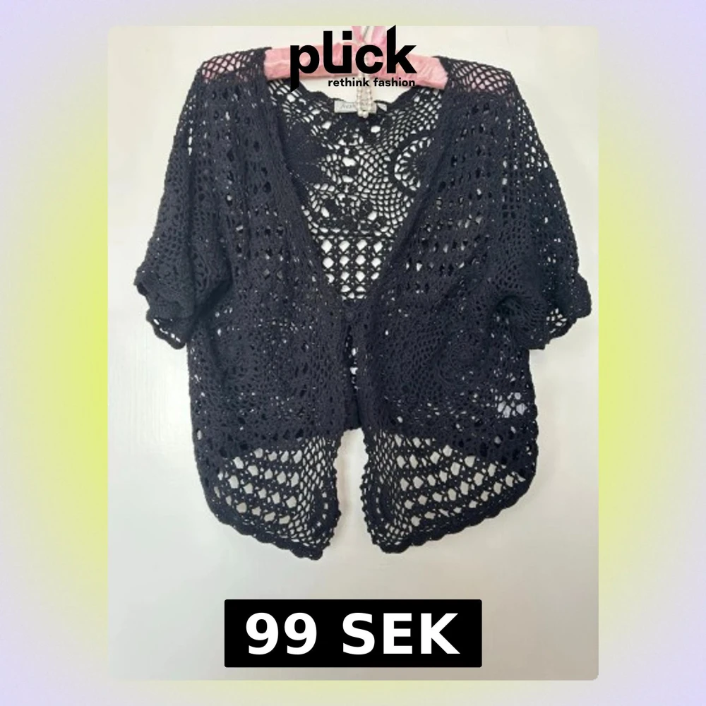 Säljer en svart, kortärmad virkad kofta från Fresh Point. Koftan har ett öppet mönster med fina detaljer och en avslappnad passform. Perfekt att slänga över en topp för en cool look. Materialet är mjukt och luftigt.