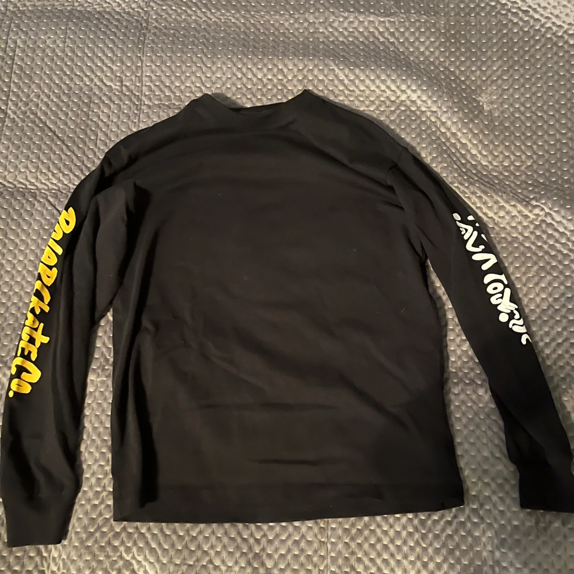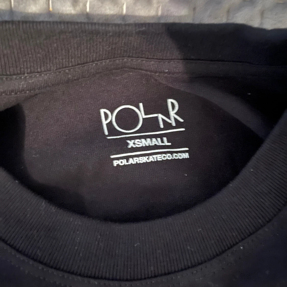 Svart longsleeve tröja från Polar Skate Co i bomull med unika vita grafiska tryck på ryggen och ena ärmen samt gul logga på andra ärmen. Perfekt för dig som gillar streetwear och vill sticka ut med coola detaljer. Tröjan har varit använd väldigt fåtal gånger och har inga defekter