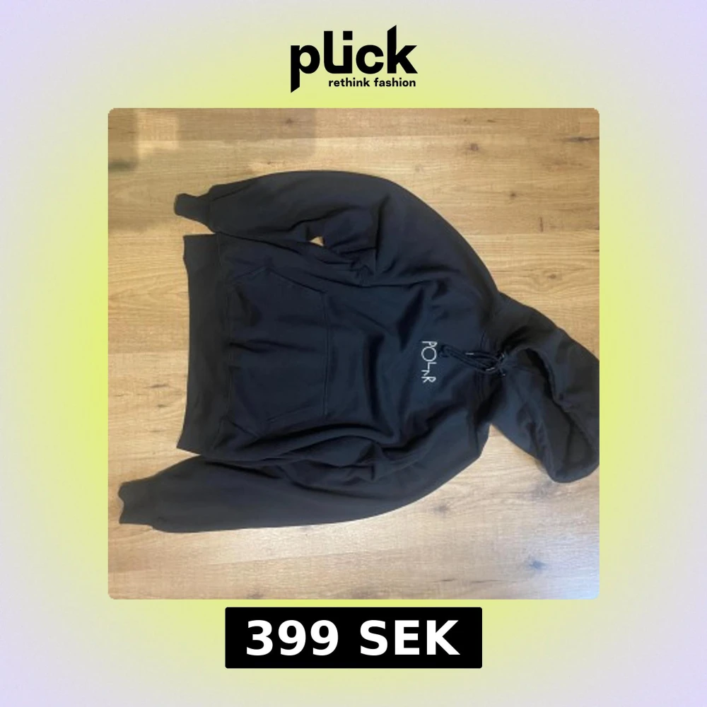 Svart hoodie från Polar i storlek XS med vit broderad logga på bröstet. Klassisk känguruficka framtill, snörning i huvan och mjukt material som känns skönt mot huden. Perfekt för dig som gillar streetwear och enkel stil.
