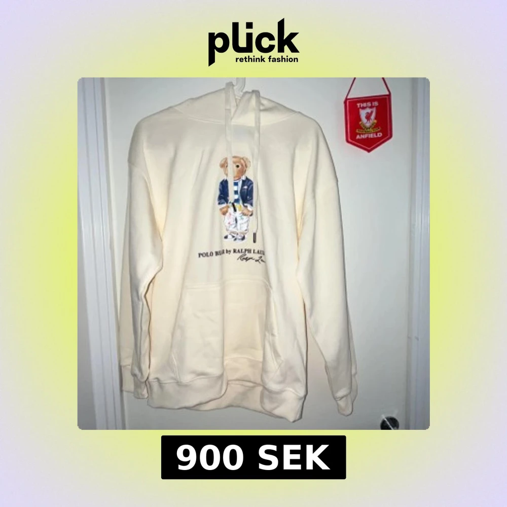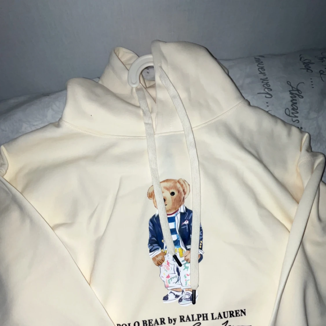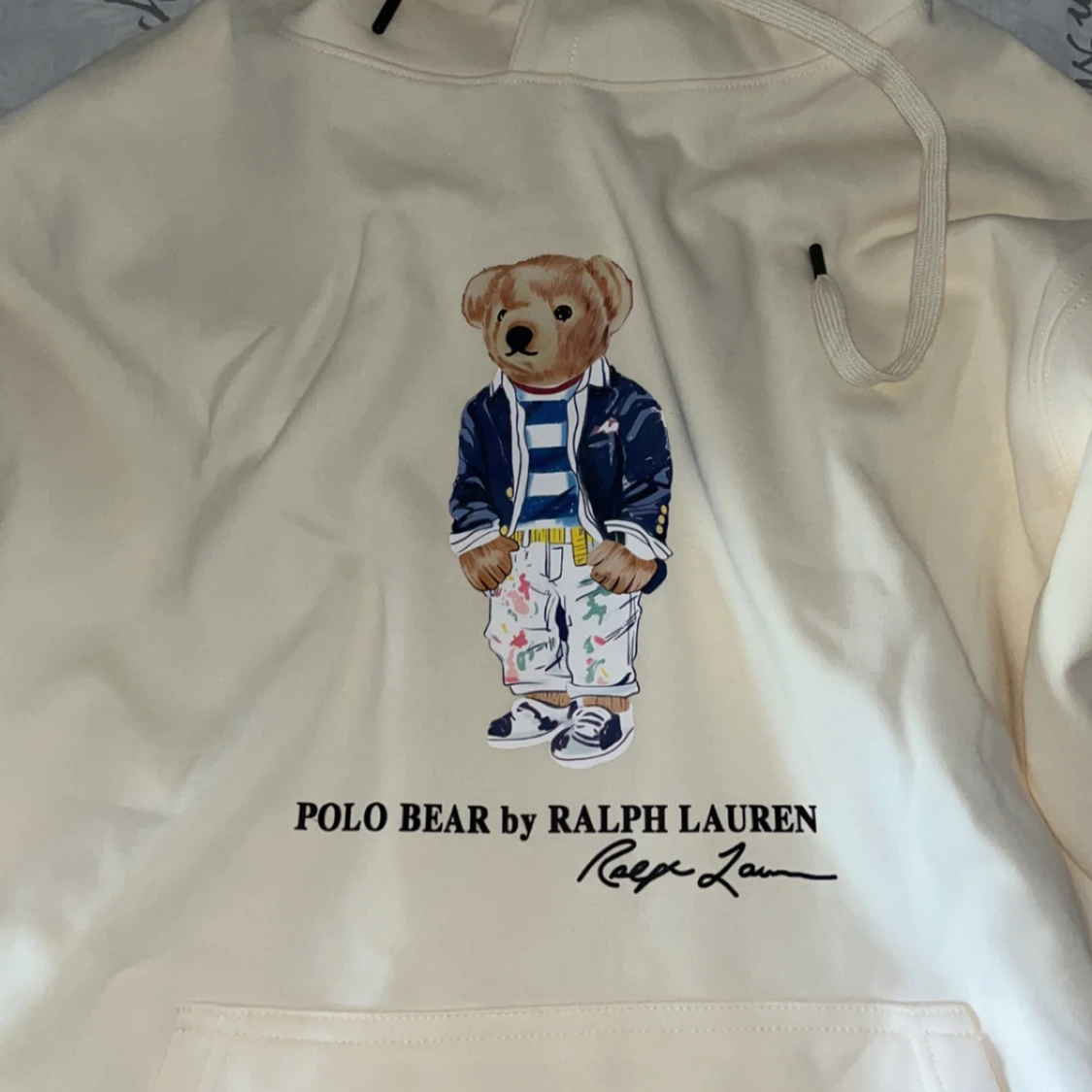 Krämvit hoodie från Ralph Lauren med Polo Bear-tryck framtill. Tröjan har huva med snörning, känguruficka och långa ärmar. Materialet känns mjukt och skönt, perfekt för chill dagar. Klassisk och stilren design med ikonisk björn.