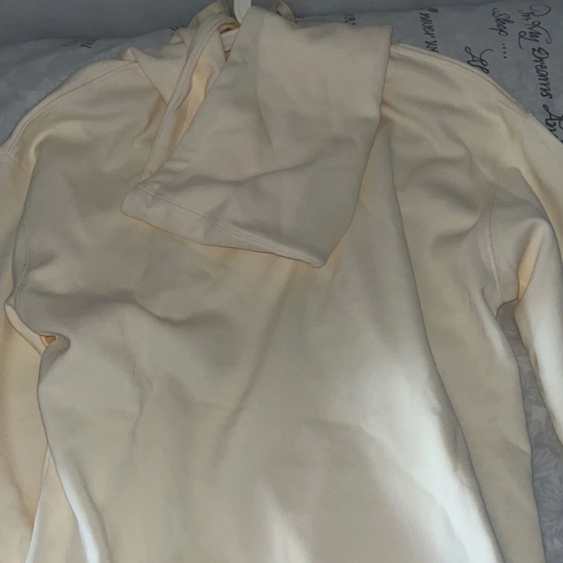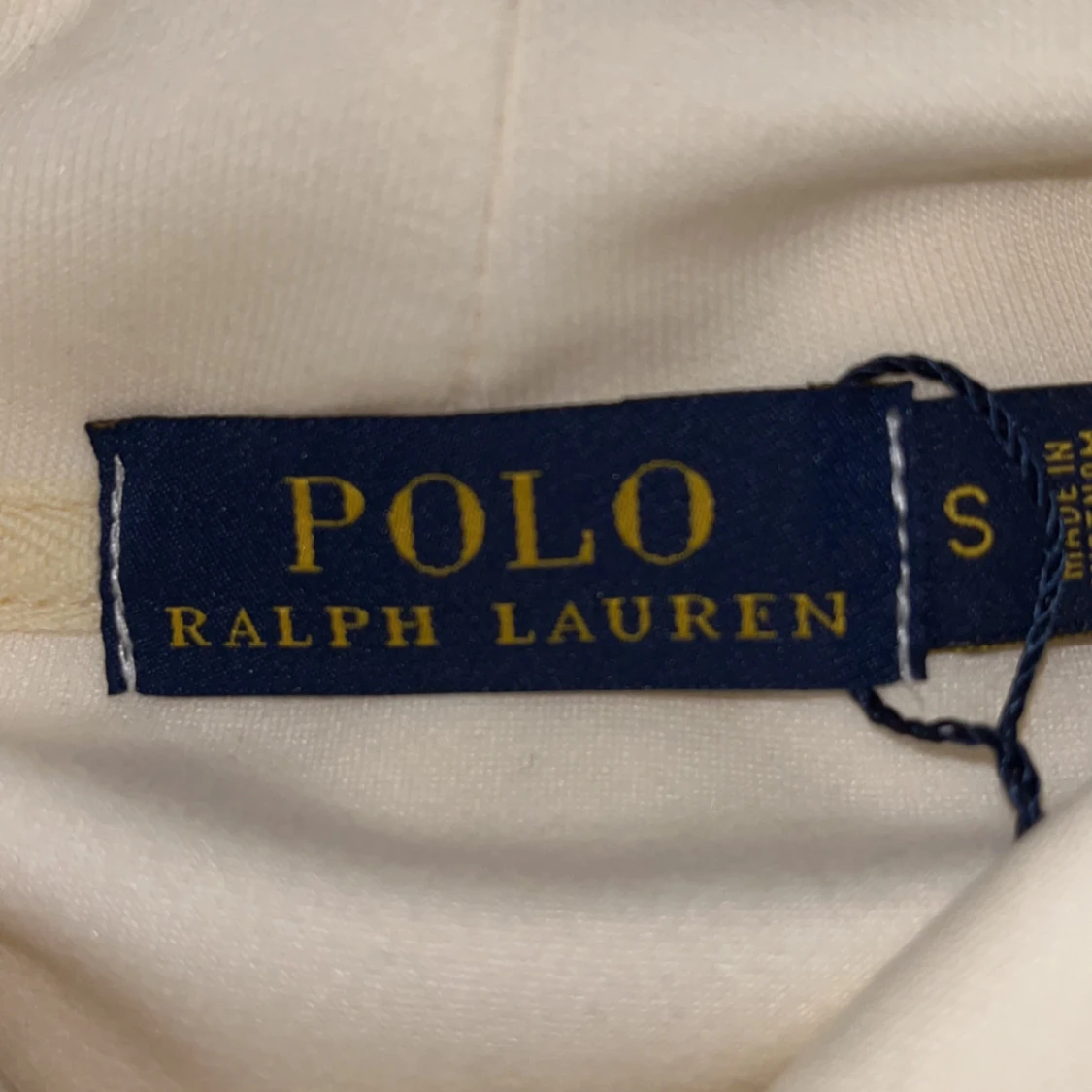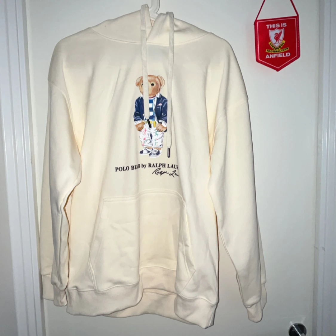 Krämvit hoodie från Ralph Lauren med Polo Bear-tryck framtill. Tröjan har huva med snörning, känguruficka och långa ärmar. Materialet känns mjukt och skönt, perfekt för chill dagar. Klassisk och stilren design med ikonisk björn.