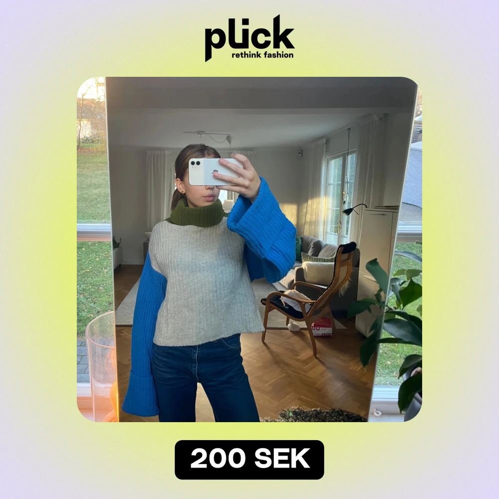 Säljer en unik stickad tröja med coola färgblock i grått, blått och grönt. Tröjan har långa ärmar och en loose passform, perfekt för höst och vinter. Den är supermysig och stilren 💚💙🩶