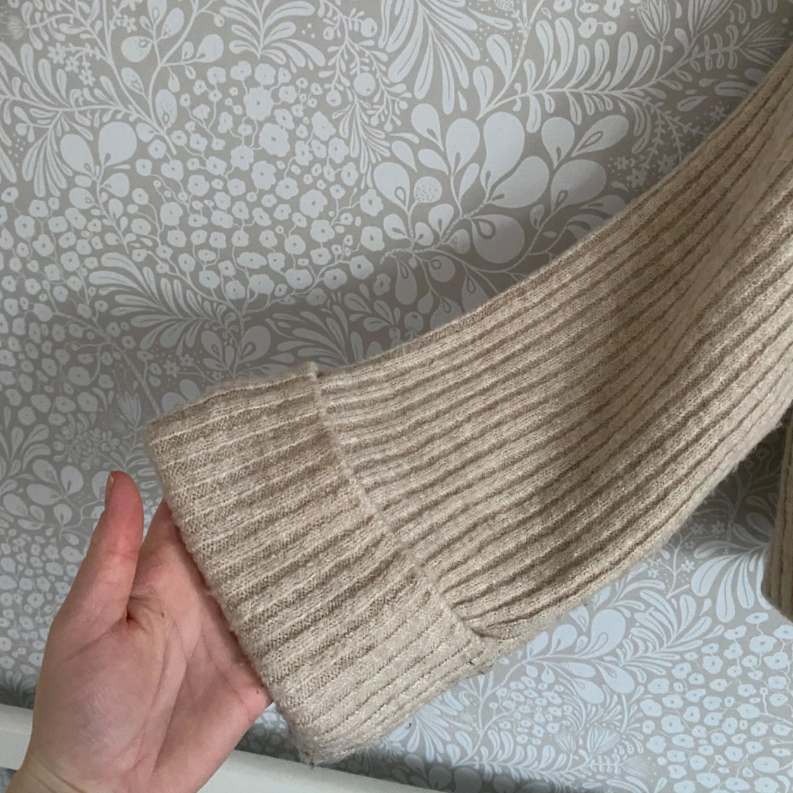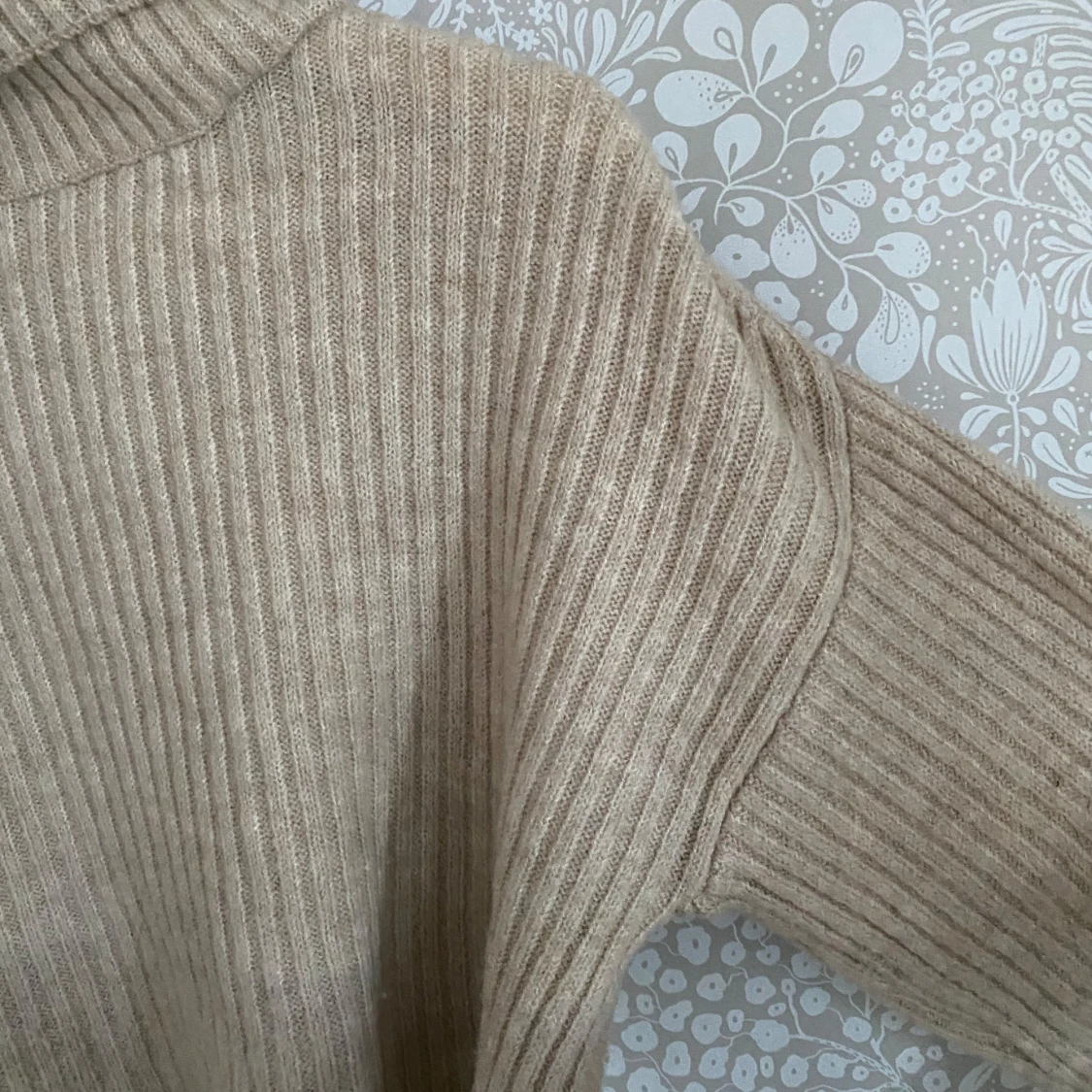 Säljer en snygg beige ribbad polotröja med långa ärmar. Tröjan är croppad och har en hög polokrage som ger en stilren look. Perfekt för kyligare dagar!