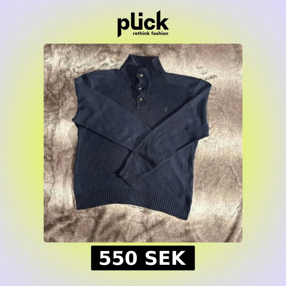 Säljer en snygg mörkblå tröja från Polo Ralph Lauren i storlek L. Tröjan är tillverkad i 100% bomull och har en ribbad krage med knappar. Perfekt för kyligare dagar med sin stilrena design och långa ärmar.