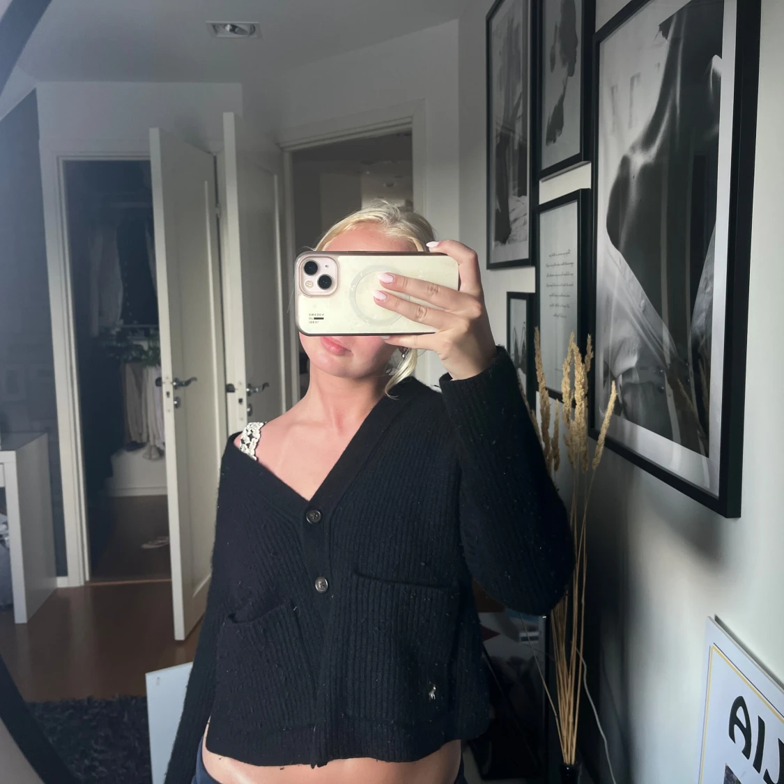 Svart ribbstickad kofta från Polo Ralph Lauren med v-ringning, stora knappar och två fickor framtill. Modellen är lite croppad och har lång ärm. Perfekt för lager-på-lager och chill vibe - den passar perfekt om man är frusen en sommarkväll!☀️👗