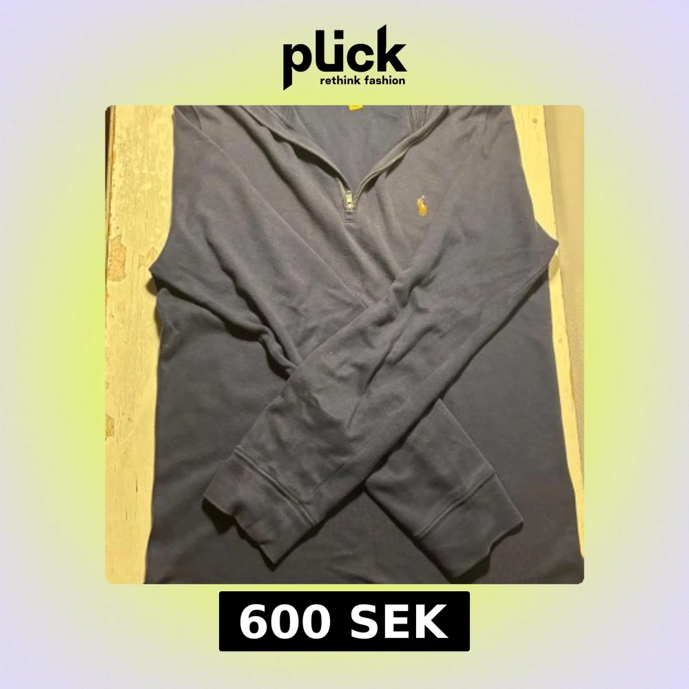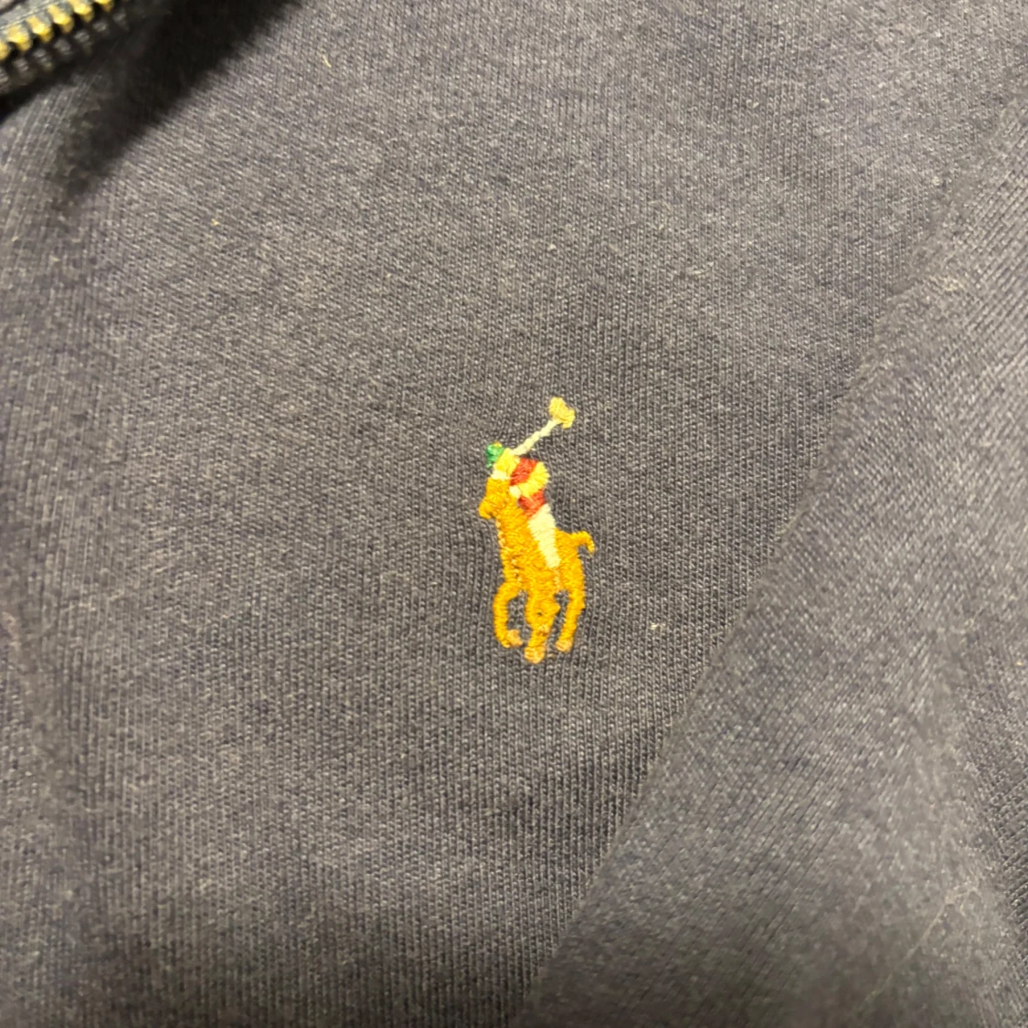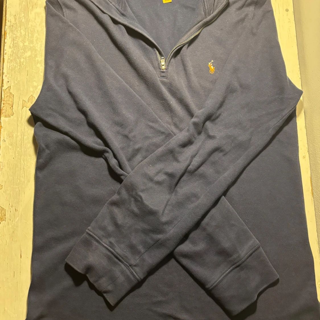 Mörkblå långärmad tröja från Polo Ralph Lauren med klassisk broderad logga på bröstet. Tröjan har en half zip-dragkedja vid halsen och är gjord i mjuk bomull. Barnstorlek XL vilket ungefär motsvarar S. Lite smutsig på bilderna, tvättas såklart innan köp. Priset kan diskuteras och kan skicka flera bilder vid behov! Byten kan även var aktuellt.