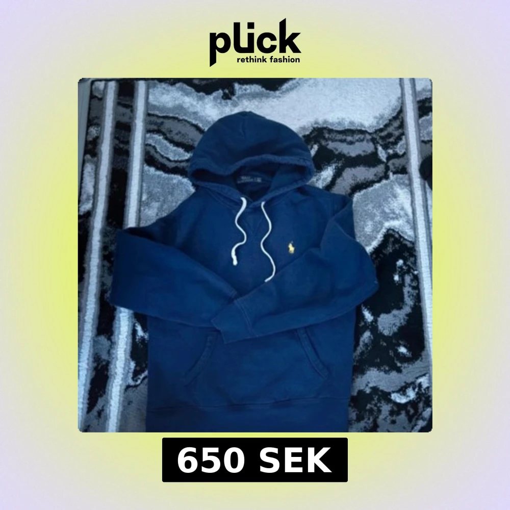 Säljer en marinblå hoodie från Polo Ralph Lauren med klassisk gul broderad logga på bröstet. Tröjan har huva med vita snören och känguruficka framtill. Tillverkad i mjuk bomullsmix för extra komfort. Perfekt för en chill och stilren look.