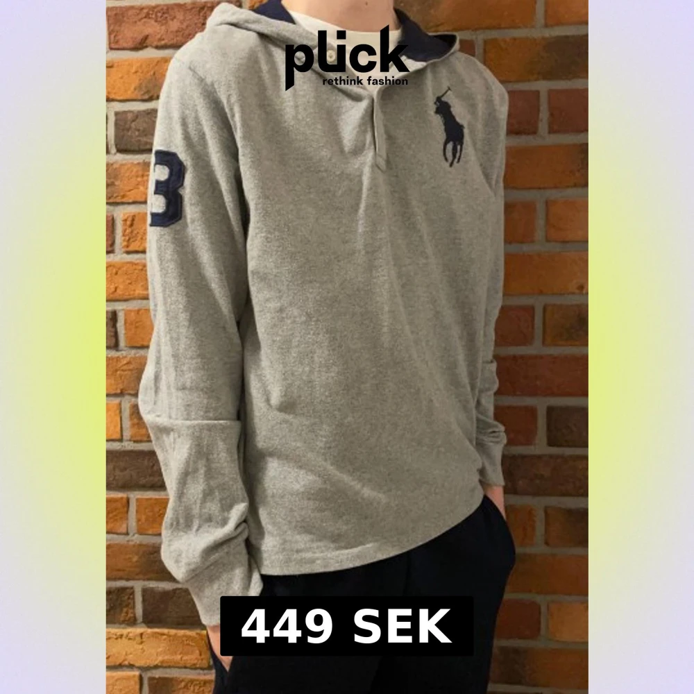 Grå hoodie från Ralph Lauren med mörkblå polospelare broderad på bröstet och en stor 3:a på ärmen. Storleken är XL i barn. Typ som xs i vuxen storlek.