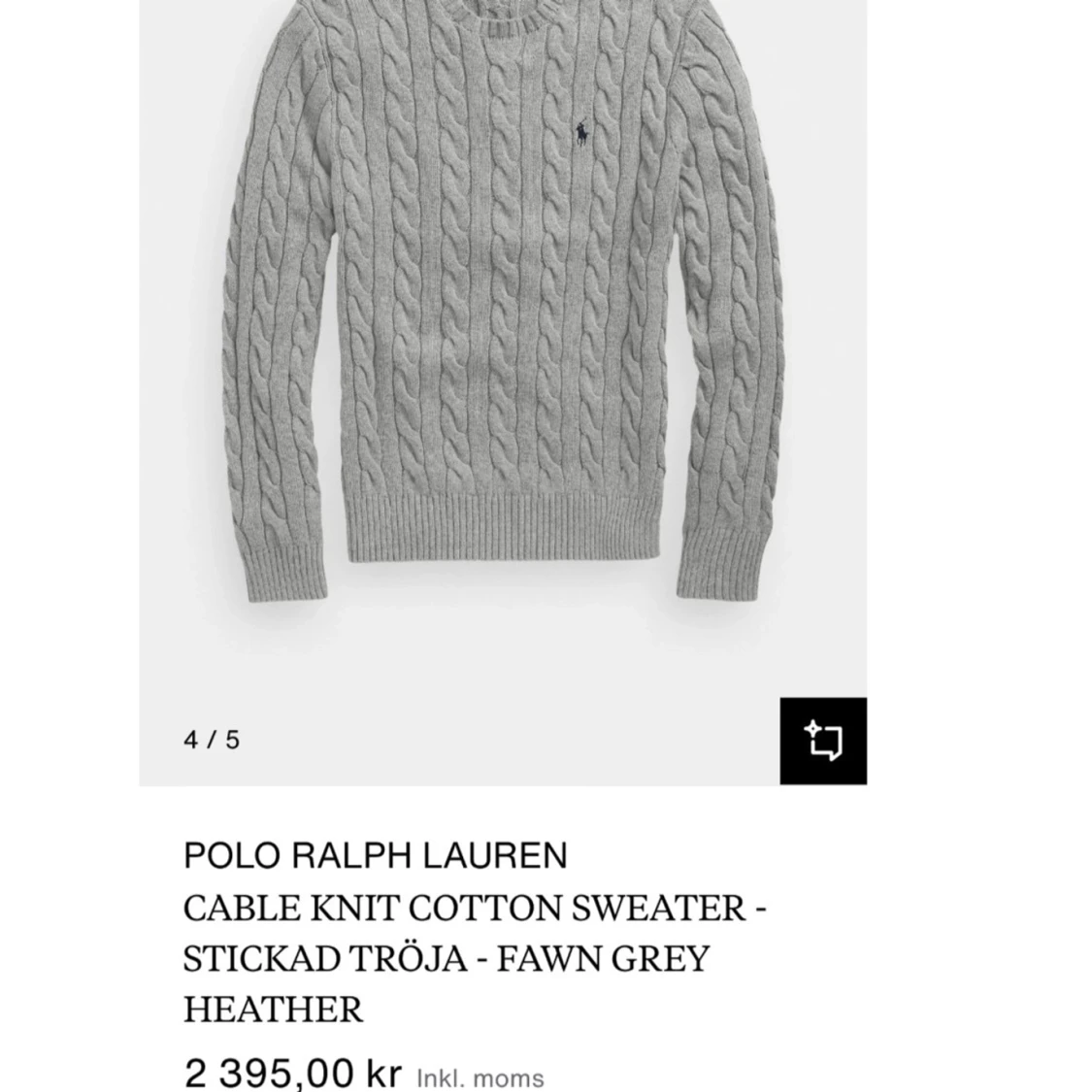 Tjena! Säljer en stilren grå kabelstickad tröja från Polo Ralph Lauren. Färgen är grå. Mycket bra skick, inga tecken på användning. Passar formella eller avslappnade outfits. Säljer för endast 699kr, köpt från Zalando för 2395kr. Priset är ej hugget i sten. Hör av er vid funderingar 🙌.