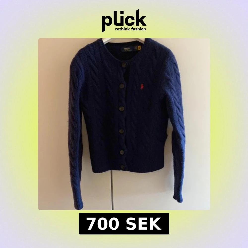 Säljer en snygg mörkblå kofta från Polo Ralph Lauren. Den är stickad med ett klassiskt kabelstickat mönster och har knappar framtill. Koftan är tillverkad i en mjuk ull- och kashmirblandning, vilket gör den både varm och bekväm. Storlek M men passar mer S