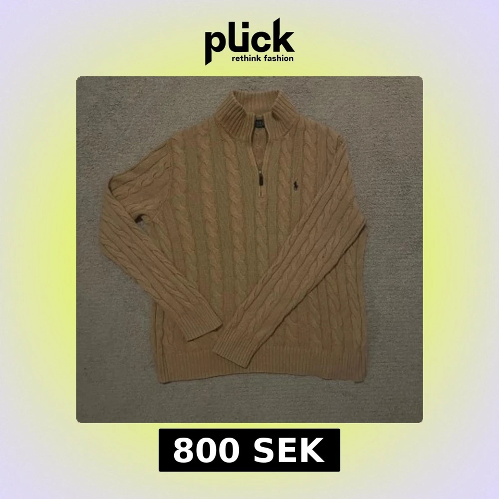 Säljer en beige stickad tröja från Polo Ralph Lauren med klassiskt kabelmönster och half zip framtill. Tröjan har långärmad design, ribbad krage och muddar. Perfekt för dig som gillar stilrena och tidlösa plagg med snygg passform.