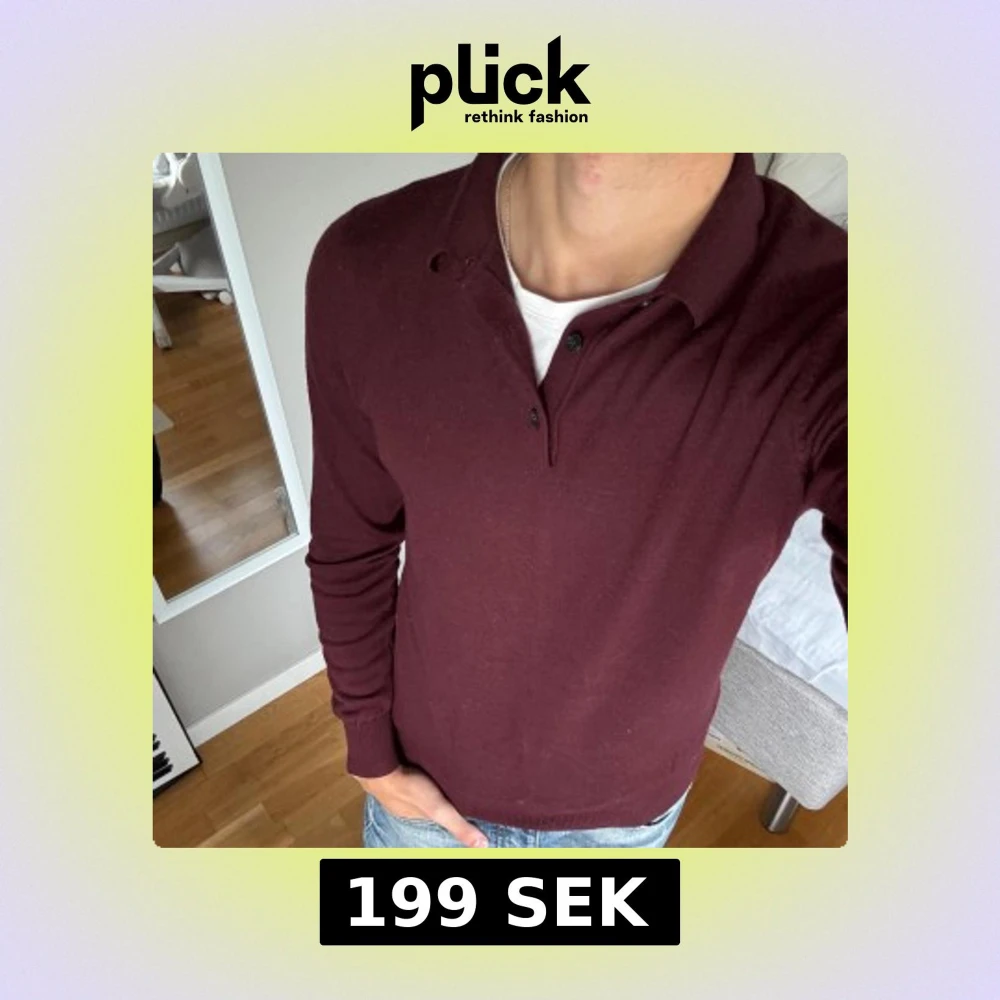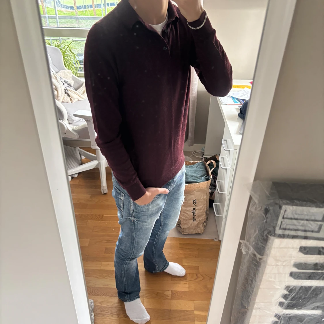 Säljer en vinröd långärmad pikétröja med klassisk krage och knappar framtill. Tröjan har en slim passform och är tillverkad i ett mjukt material som känns skönt mot huden. Perfekt för dig som vill ha en stilren och enkel look.