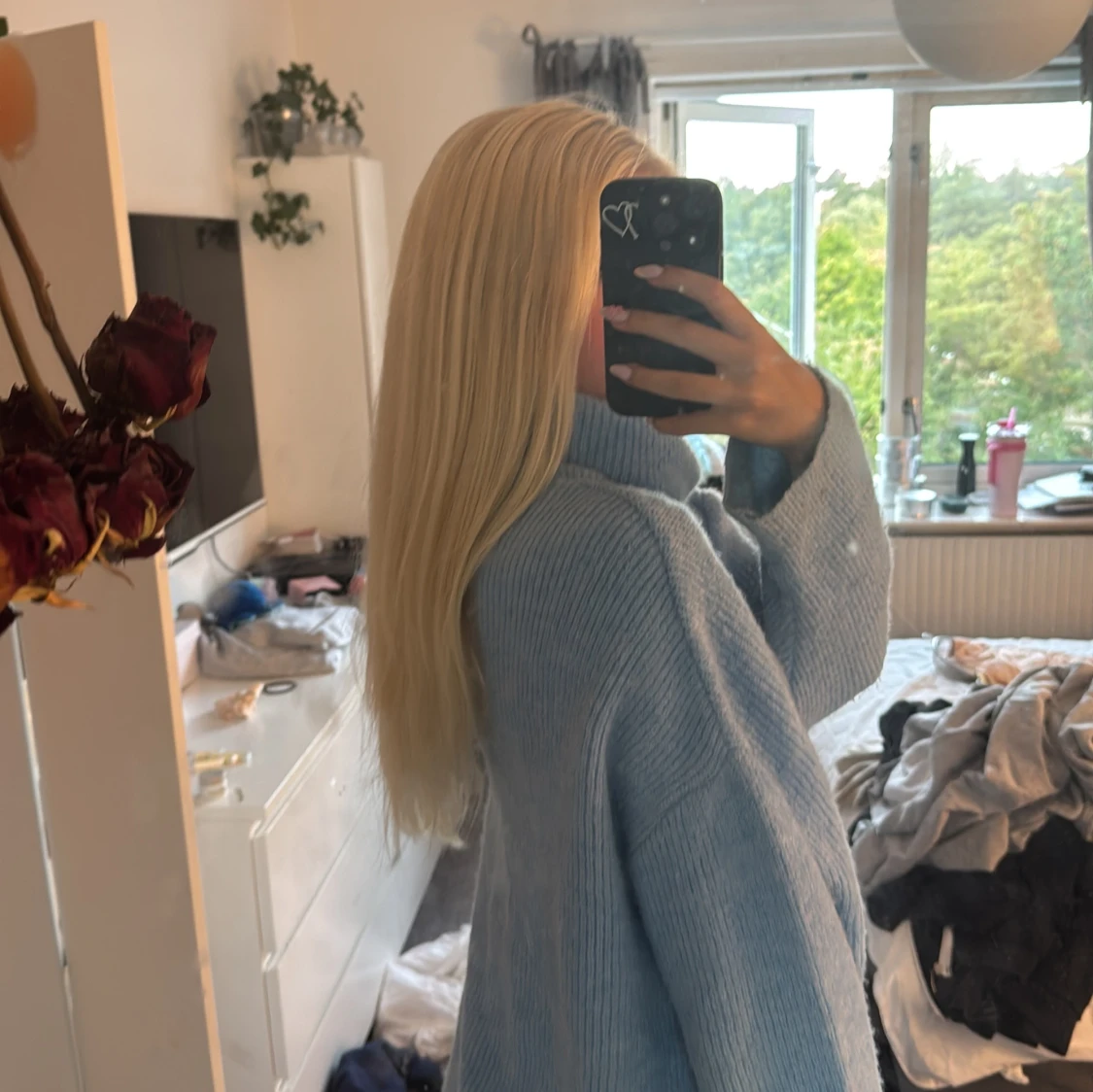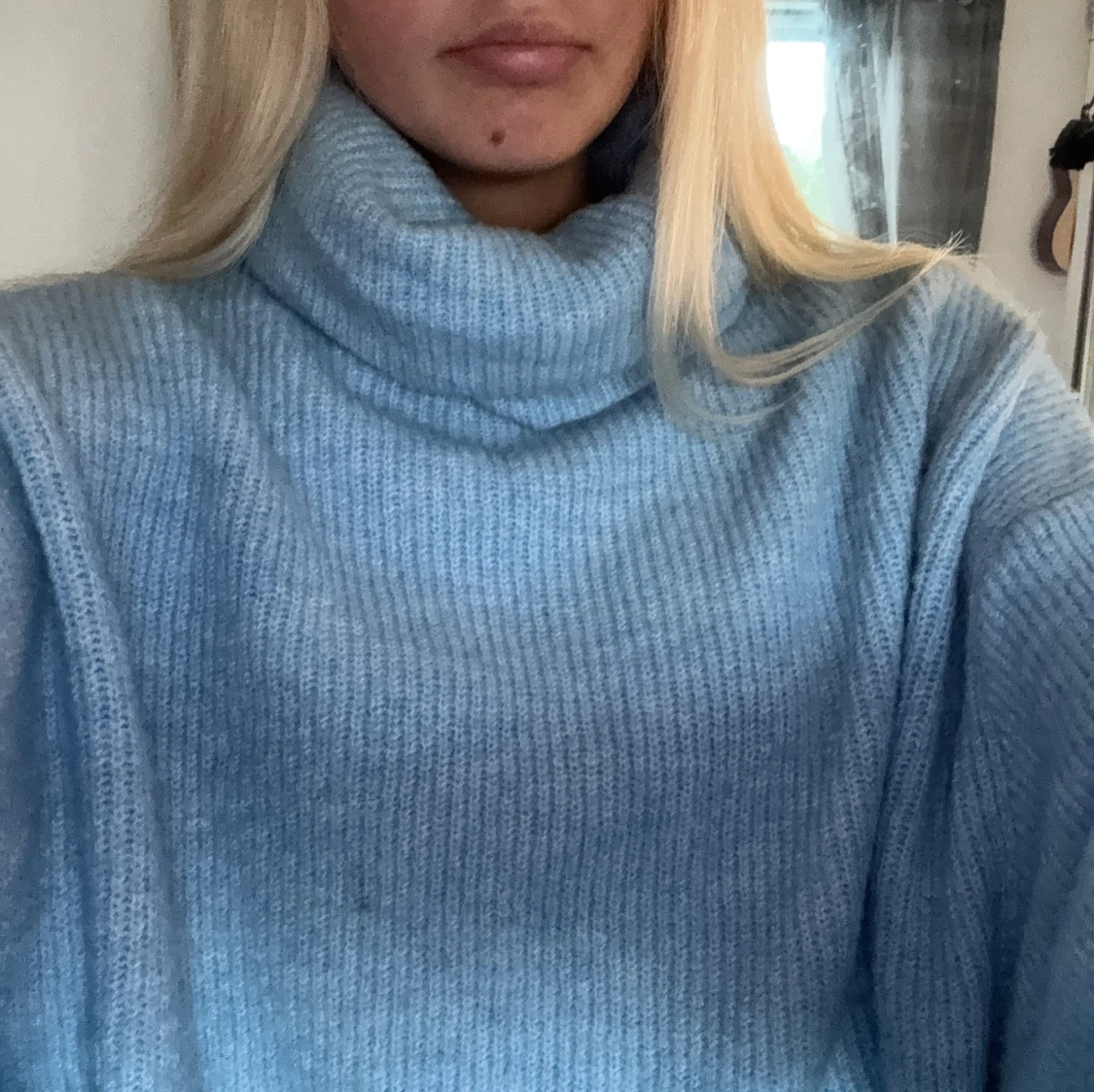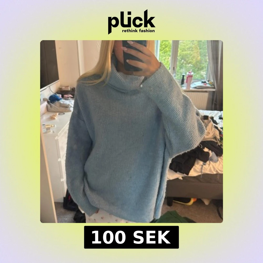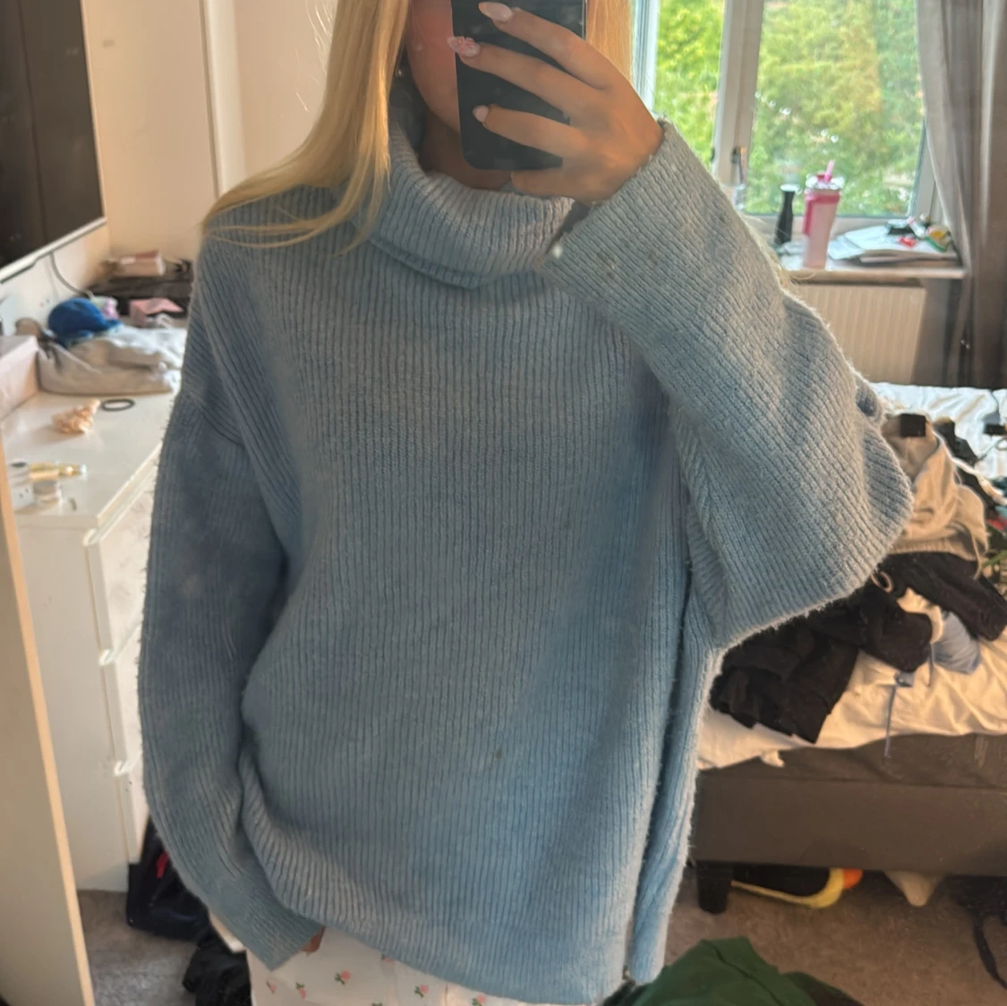 Supermysig ljusblå stickad polotröja från Dilvin. Tröjan har oversized passform, bred polokrage och långa ärmar. Perfekt för lager-på-lager och chill dagar. Ribbstickad struktur som ger en snygg och avslappnad vibe.