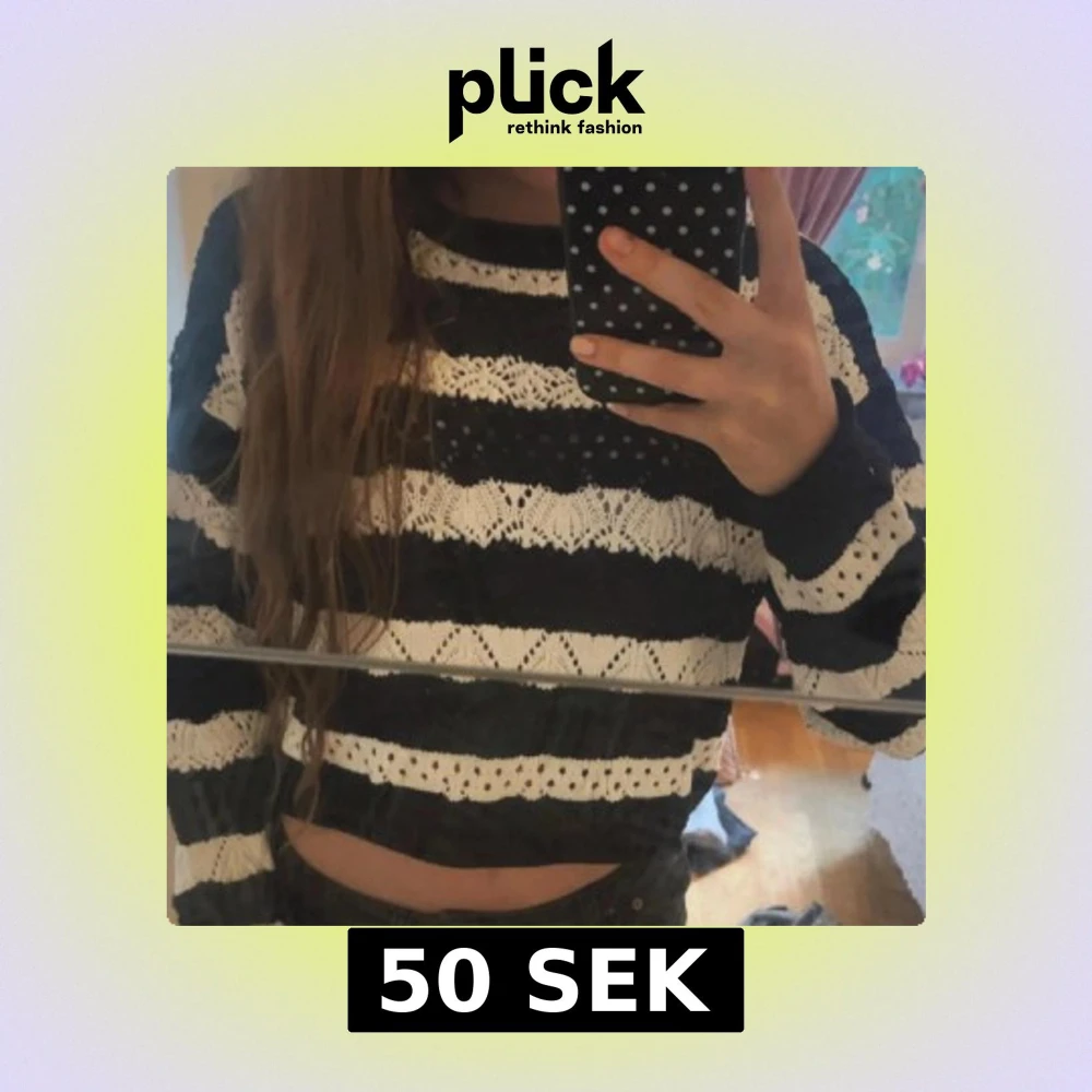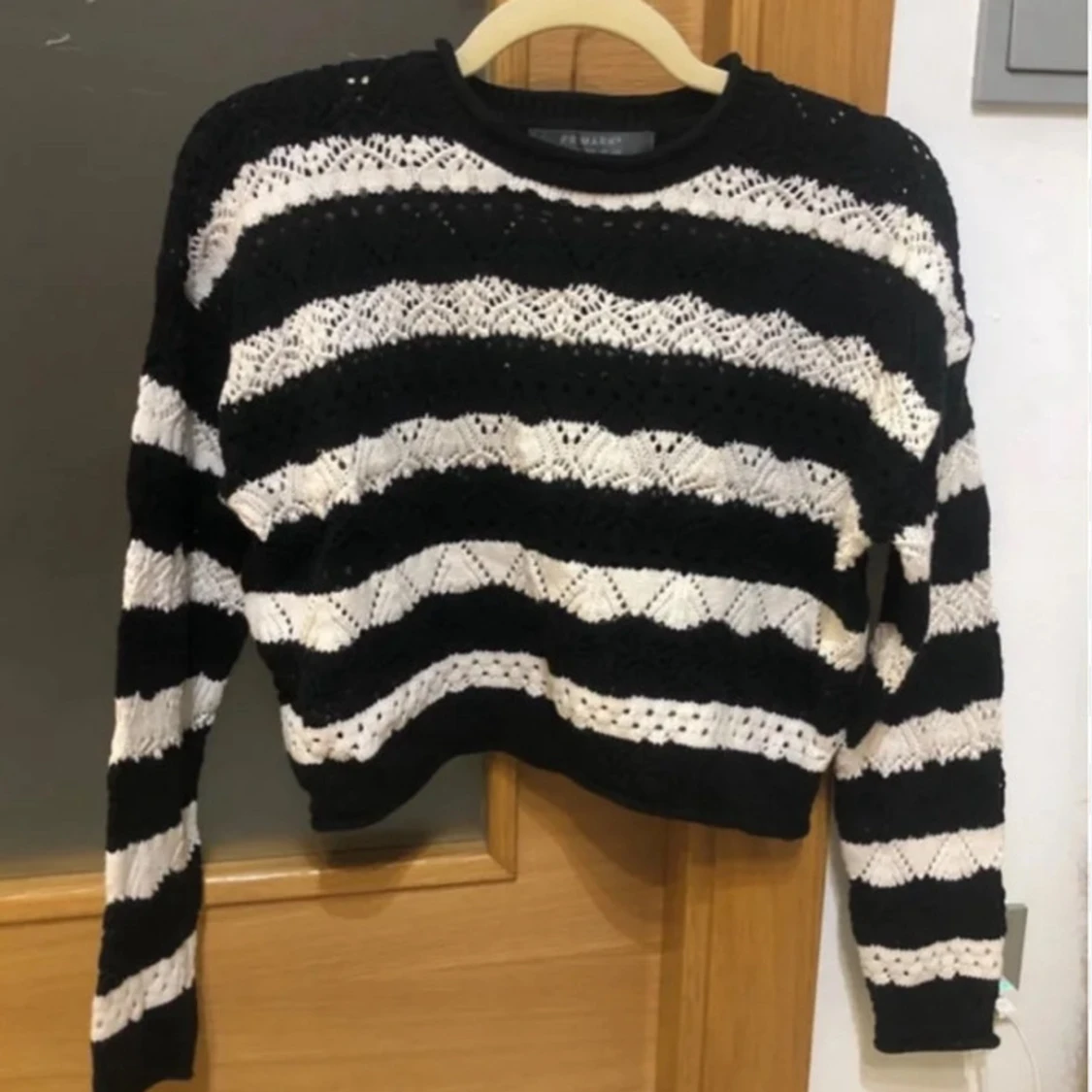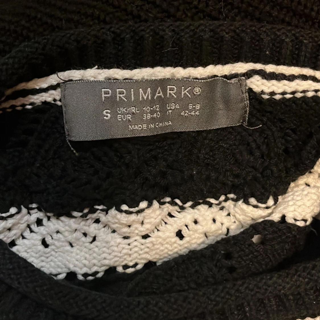 Säljer en svartvit stickad tröja från Primark i storlek S. Tröjan har breda horisontella ränder och ett snyggt hålmönster.
