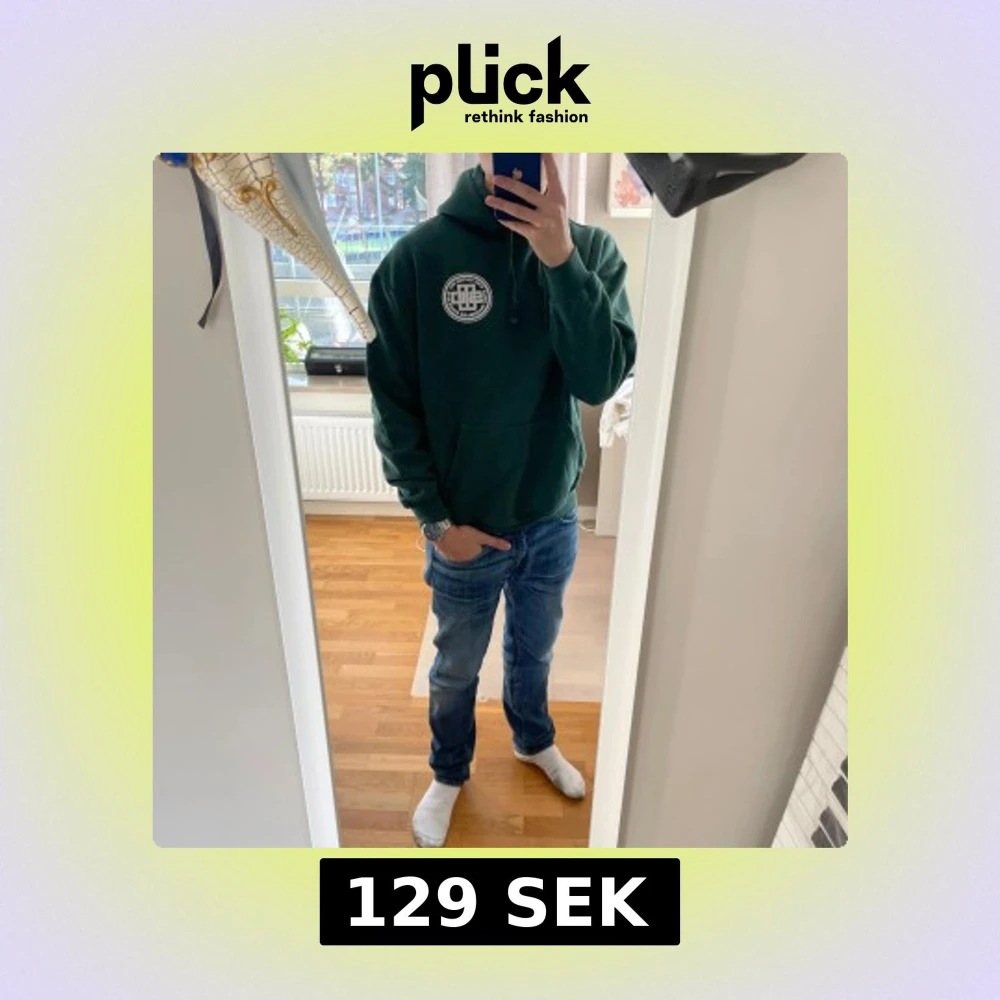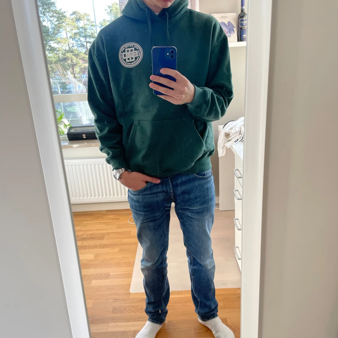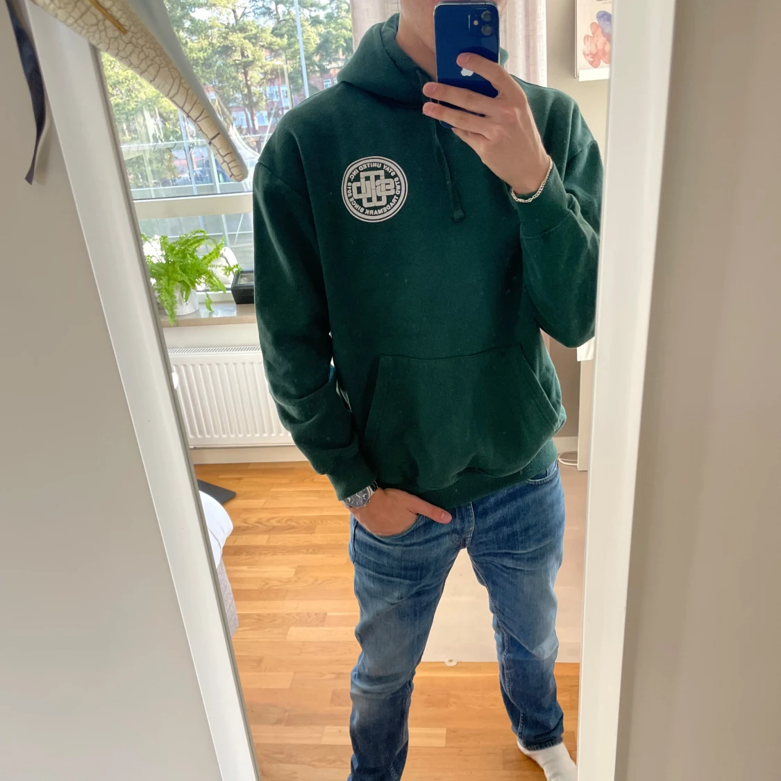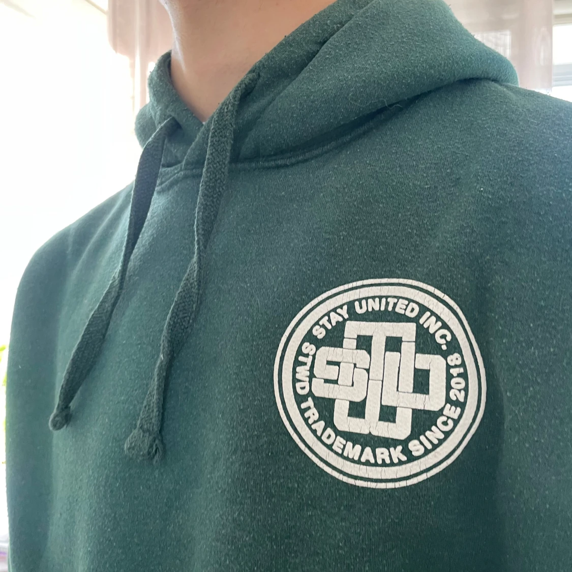 Säljer en grön hoodie från Stay United Inc. med ett vitt tryck på bröstet. Hoodien har en klassisk design med dragsko i huvan och en stor magficka. Perfekt för en avslappnad stil.