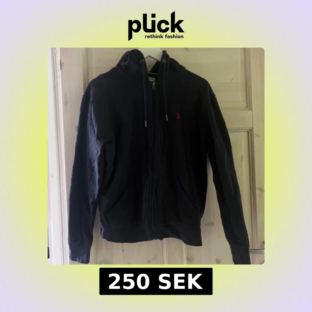 Svart hoodie från U.S. Polo Assn. i storlek M. Tröjan har dragkedja framtill, huva med snören och en liten röd broderad logga på bröstet. Perfekt för en avslappnad stil.