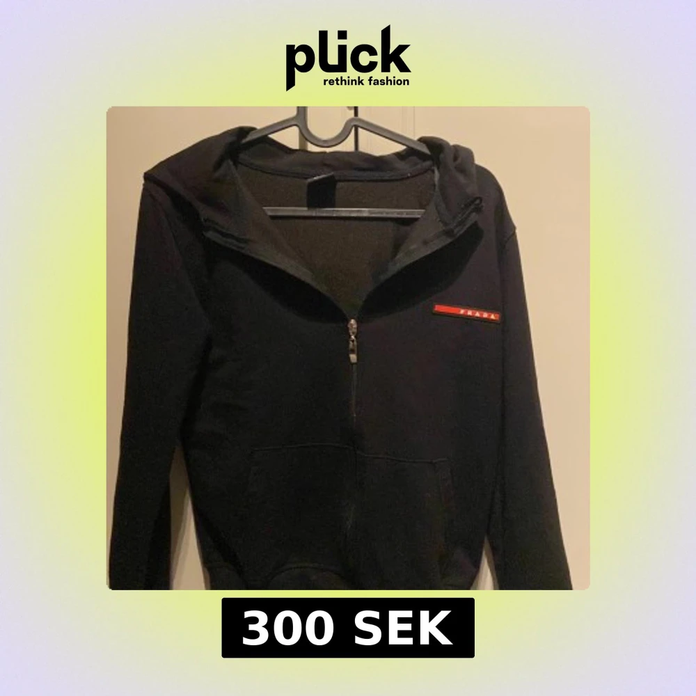 Svart hoodie från Prada med ikonisk röd logga på bröstet. Tröjan har huva, half zip-dragkedja och känguruficka framtill. Mjuk bomullskänsla och långärmad modell som passar perfekt till en chill och stilren look.