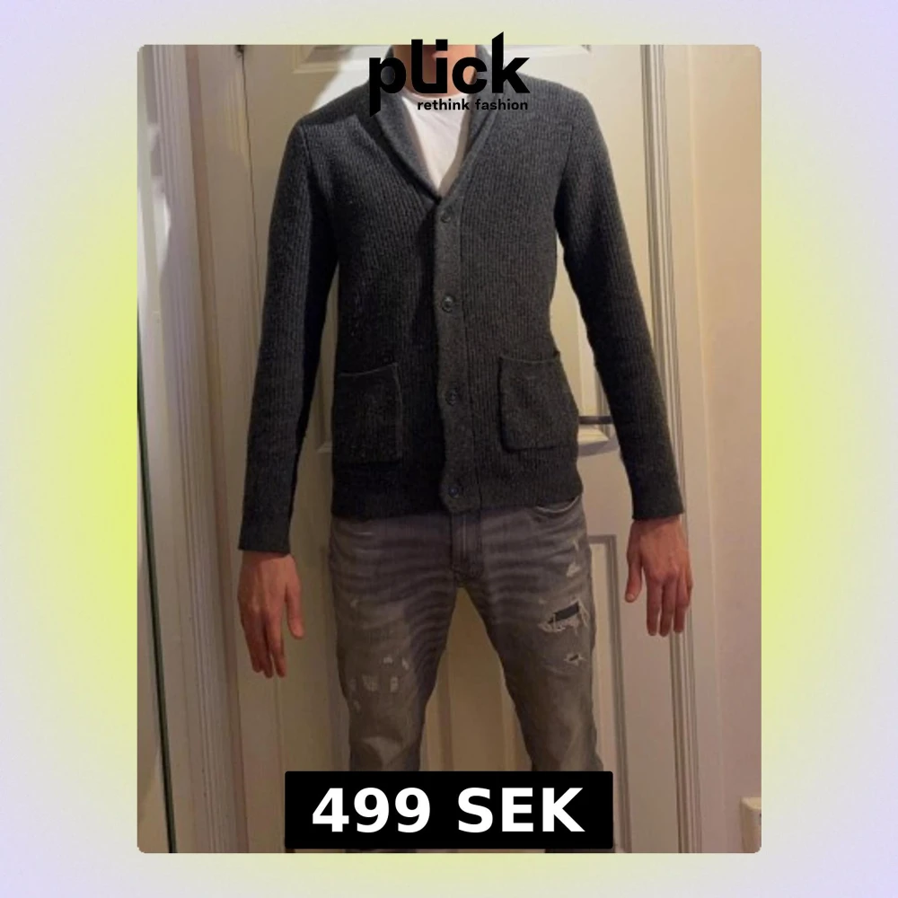 Säljer en mörkgrå, ribbstickad kofta från Dressmann i storlek M. Koftan har två framfickor, knappar framtill och en snygg sjalkrage. Perfekt för dig som gillar klassisk stil med chill vibe. Materialet är mjukt och känns skönt mot huden.