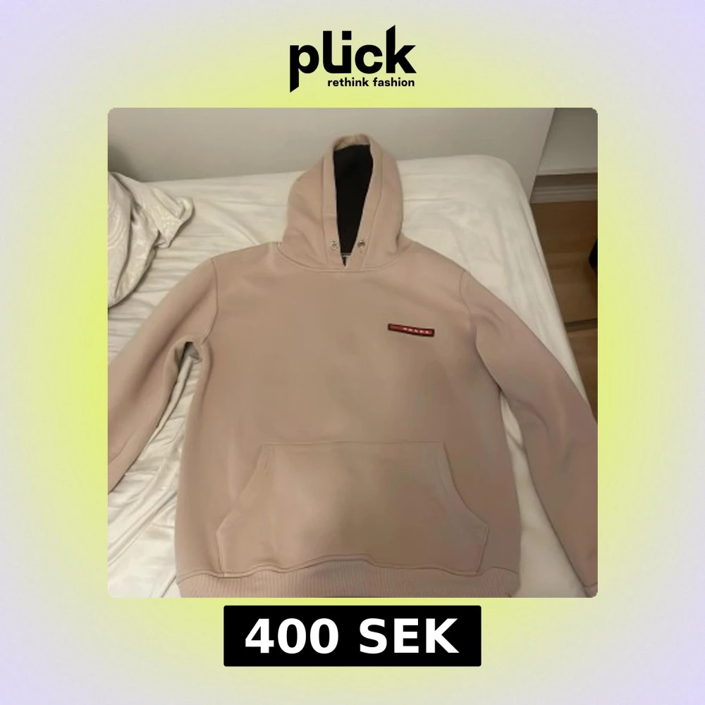 Säljer en stilren beige hoodie från Prada med en klassisk känguruficka och justerbar huva. Den har en diskret logga på bröstet och är perfekt för en avslappnad look. Passar bra till både jeans och joggers.