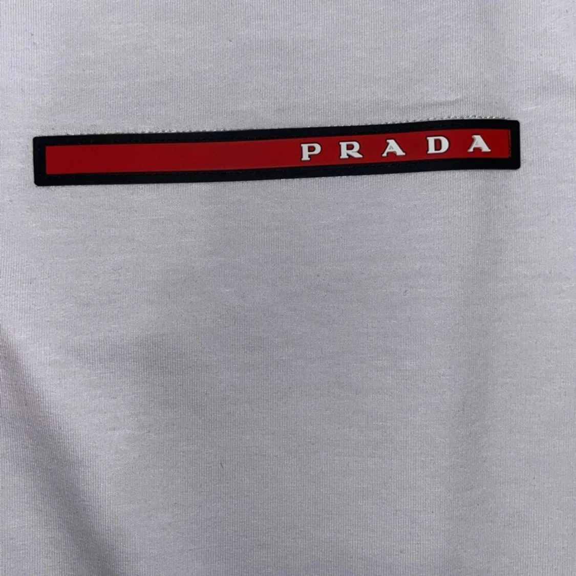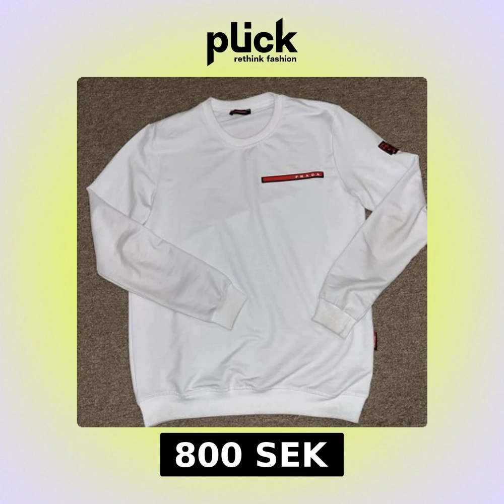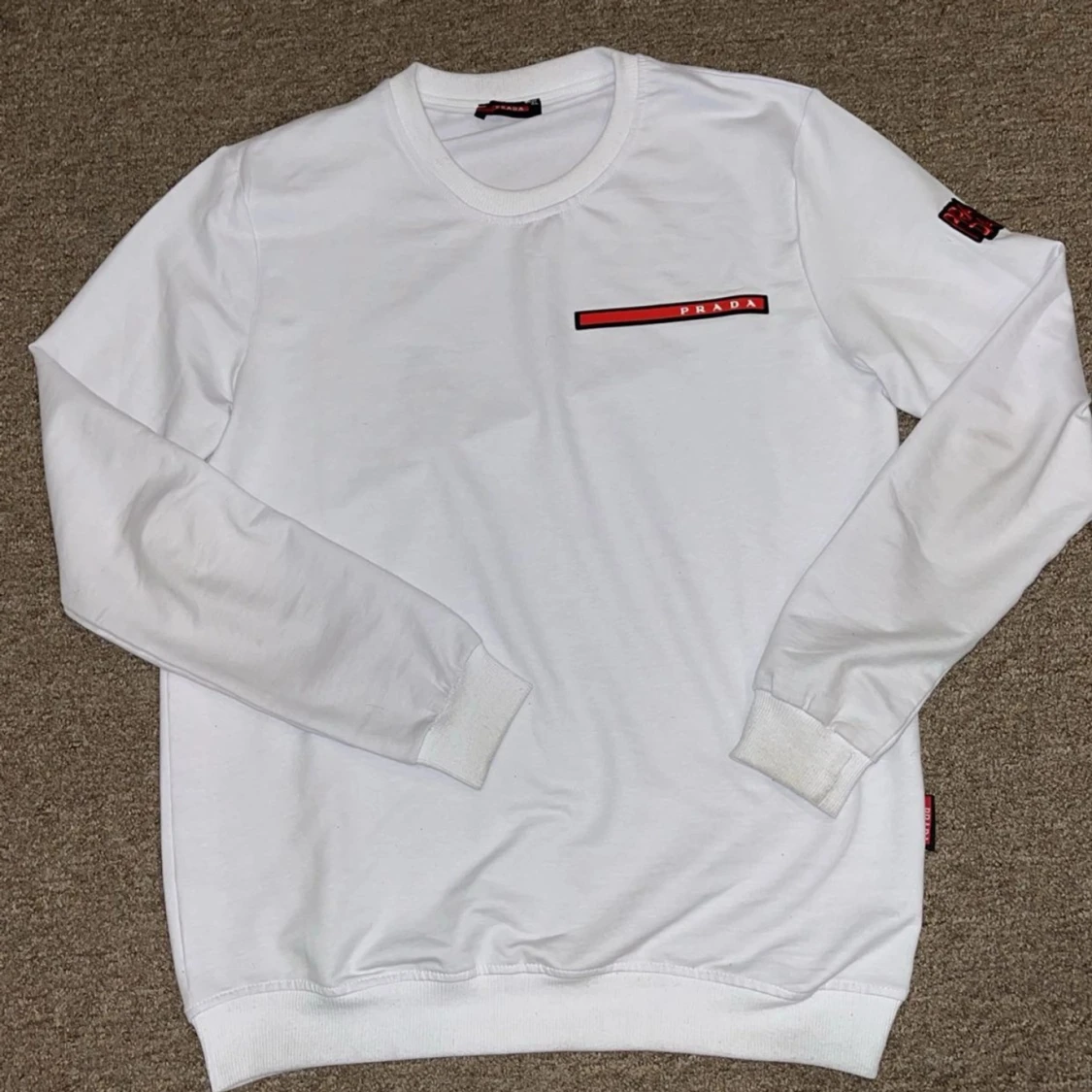 Säljer en stilren vit tröja från Prada med en röd logga på bröstet. Tröjan har långa ärmar och ribbade muddar vid ärmslut och nederkant. Perfekt för en minimalistisk look. Inga skador eller nåt sånt, kan mötas upp i stockholm men även frakta!