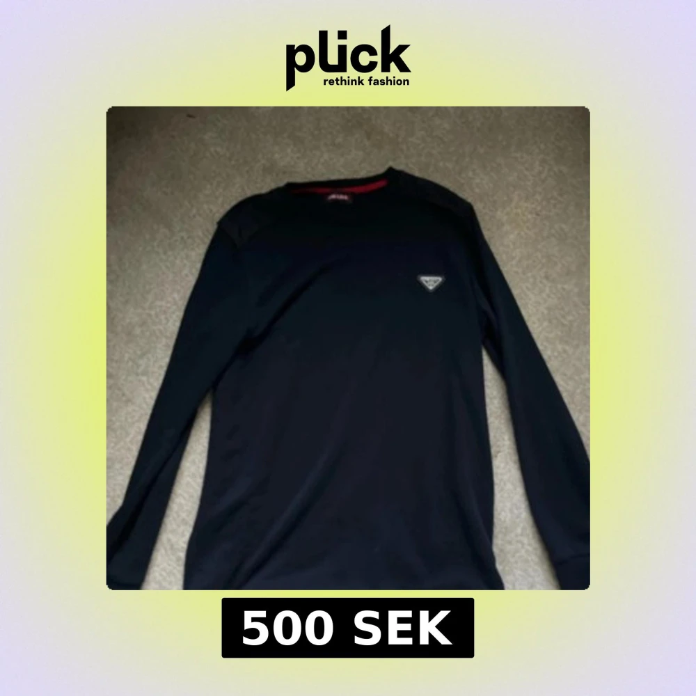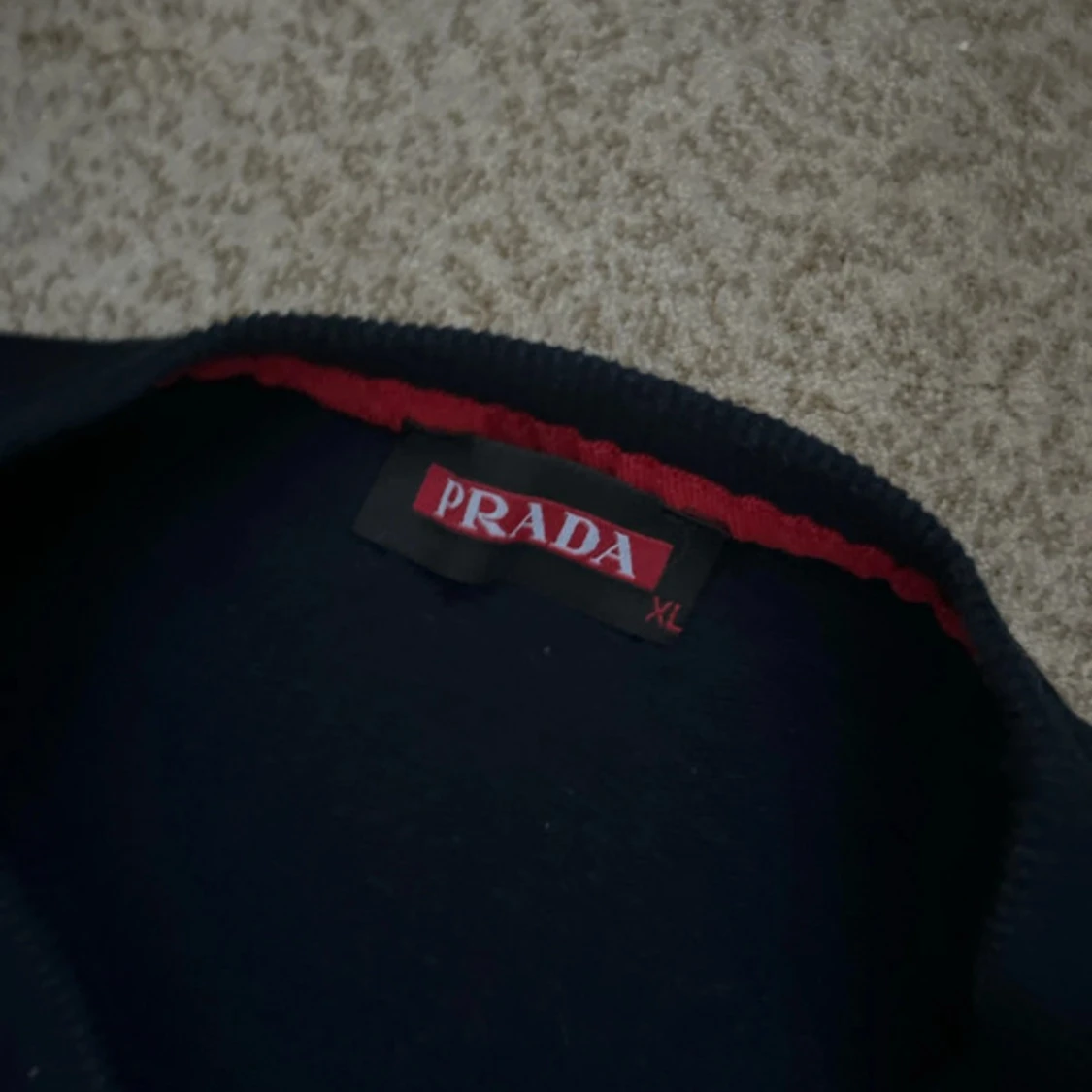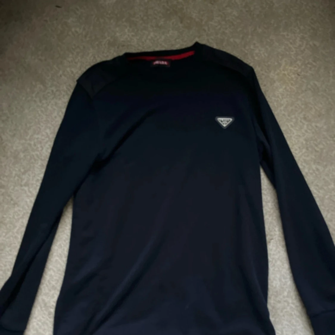 Snygg mörkblå långärmad tröja från Prada med diskret logga på bröstet och coola detaljer på axlarna. Tröjan har rund halsringning med röd insida och är i ett mjukt material som känns skönt mot huden. Perfekt för dig som gillar stilrena designer.