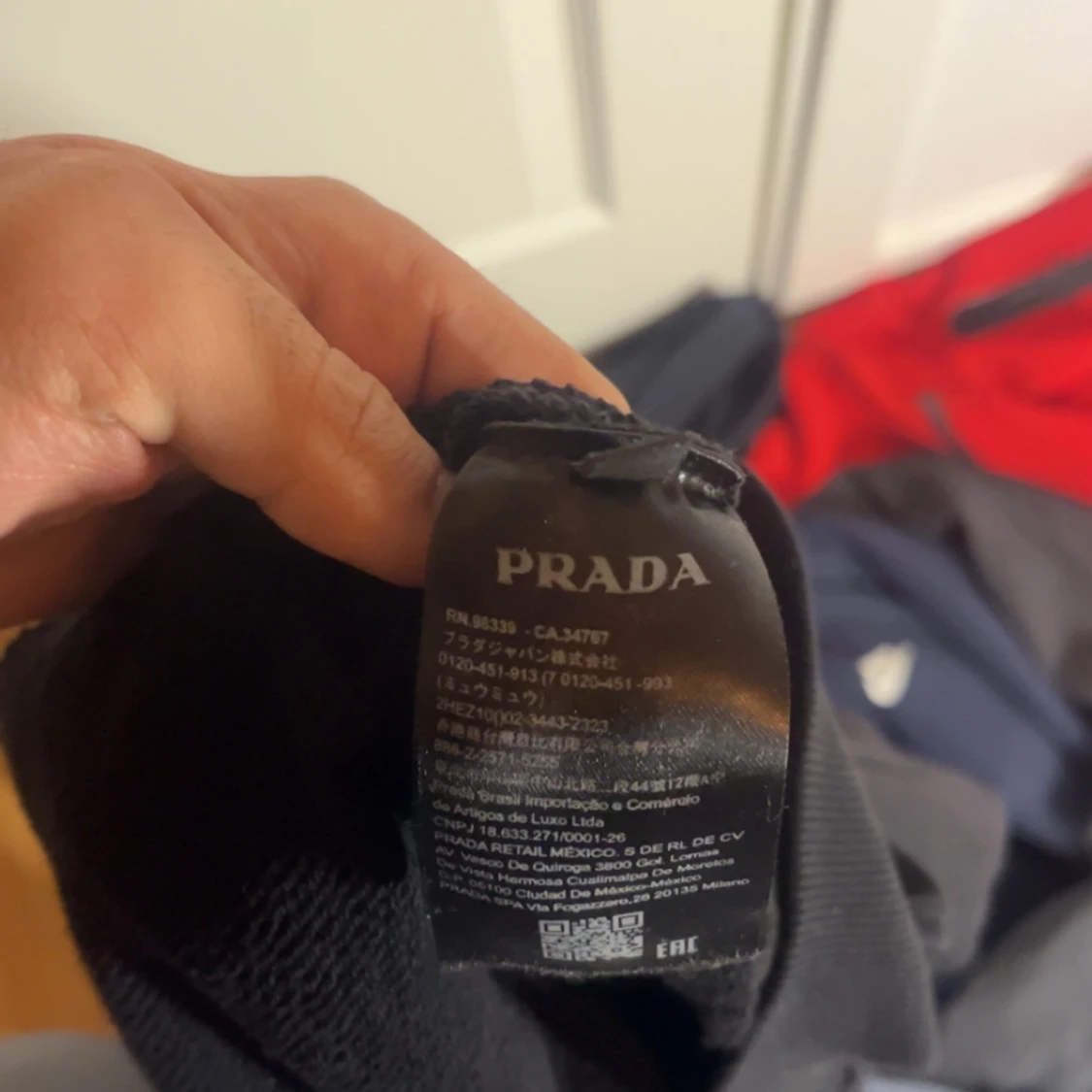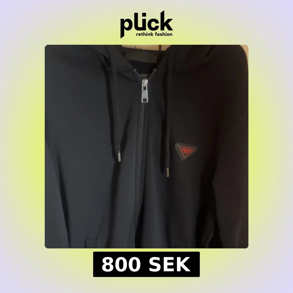 Svart hoodie från Prada med klassisk huva, snörning och dragkedja framtill. Först till kvarn, passa på!🚀