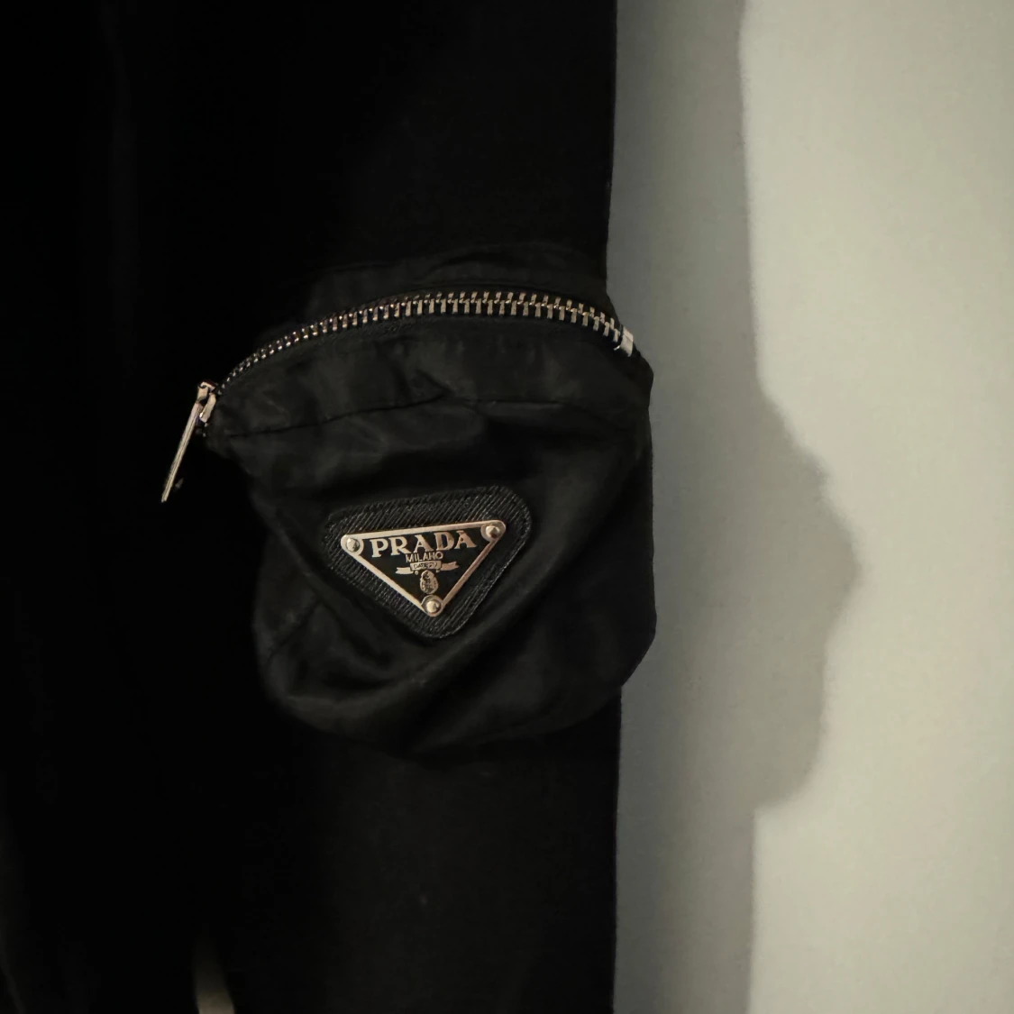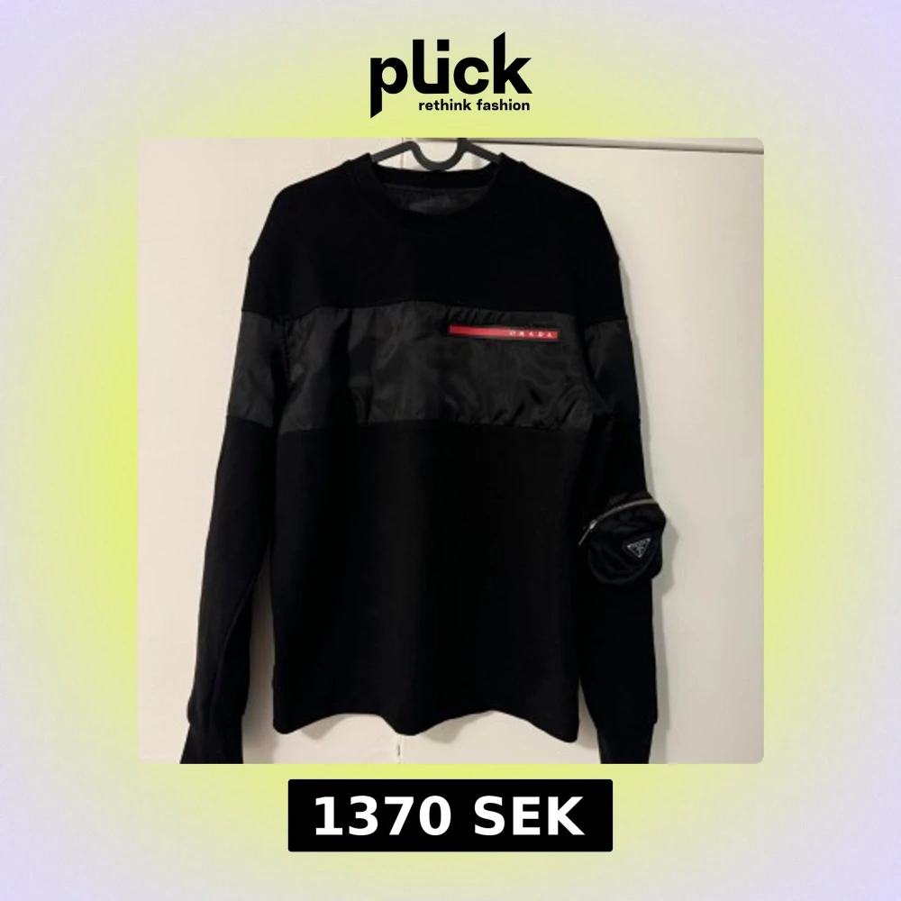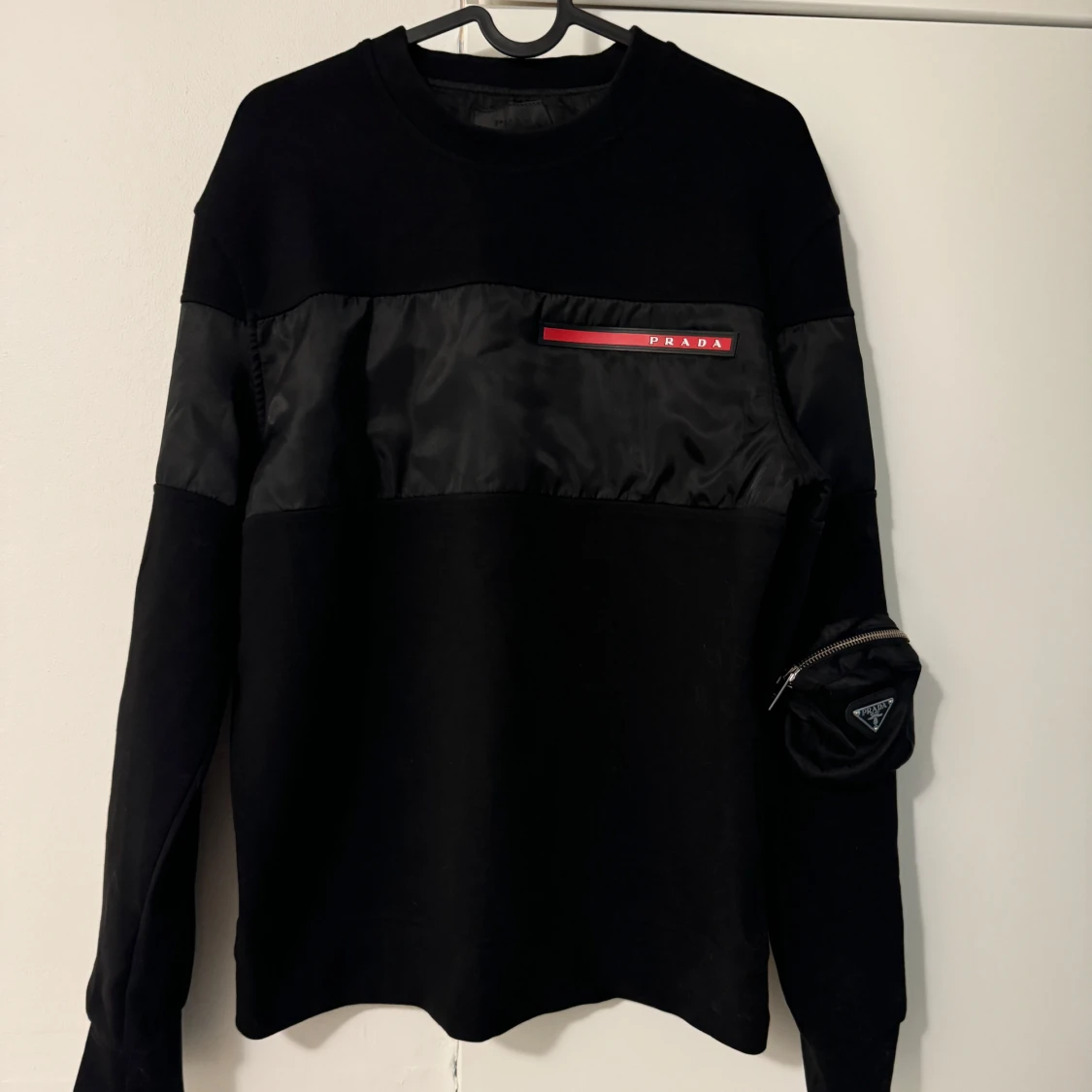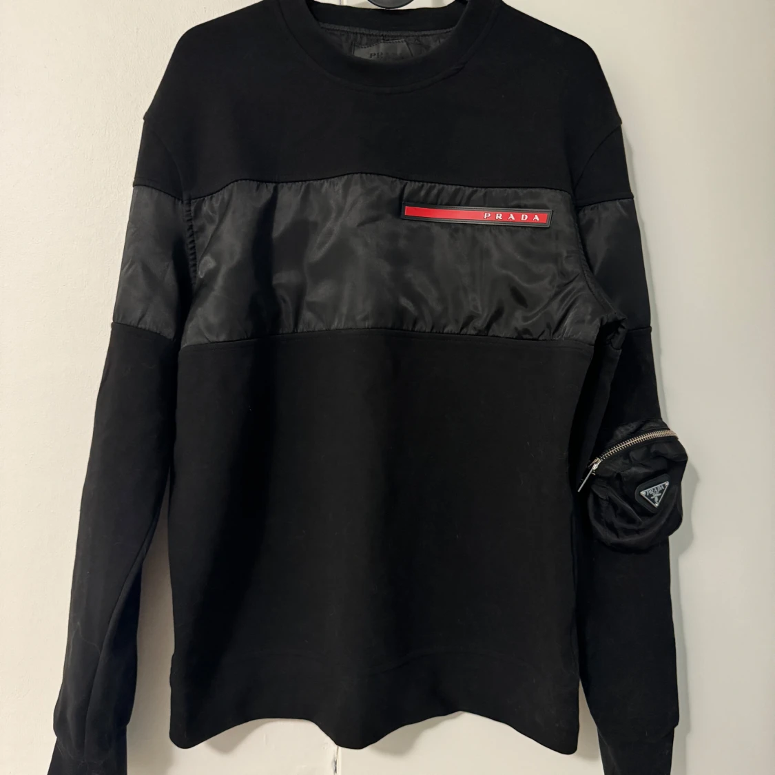 Svart sweatshirt från Prada med cool nylonpanel över bröstet och röd logodetalj. Unik ficka med dragkedja och metallogo på ena ärmen. Långärmad och i en mix av bomull och nylon för en modern vibe. Endast testad. Storlek S men passar även M.