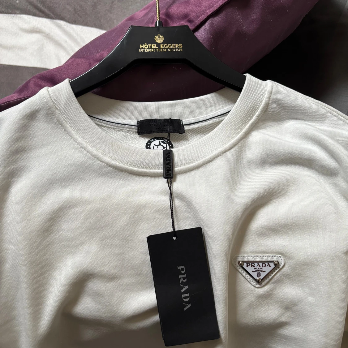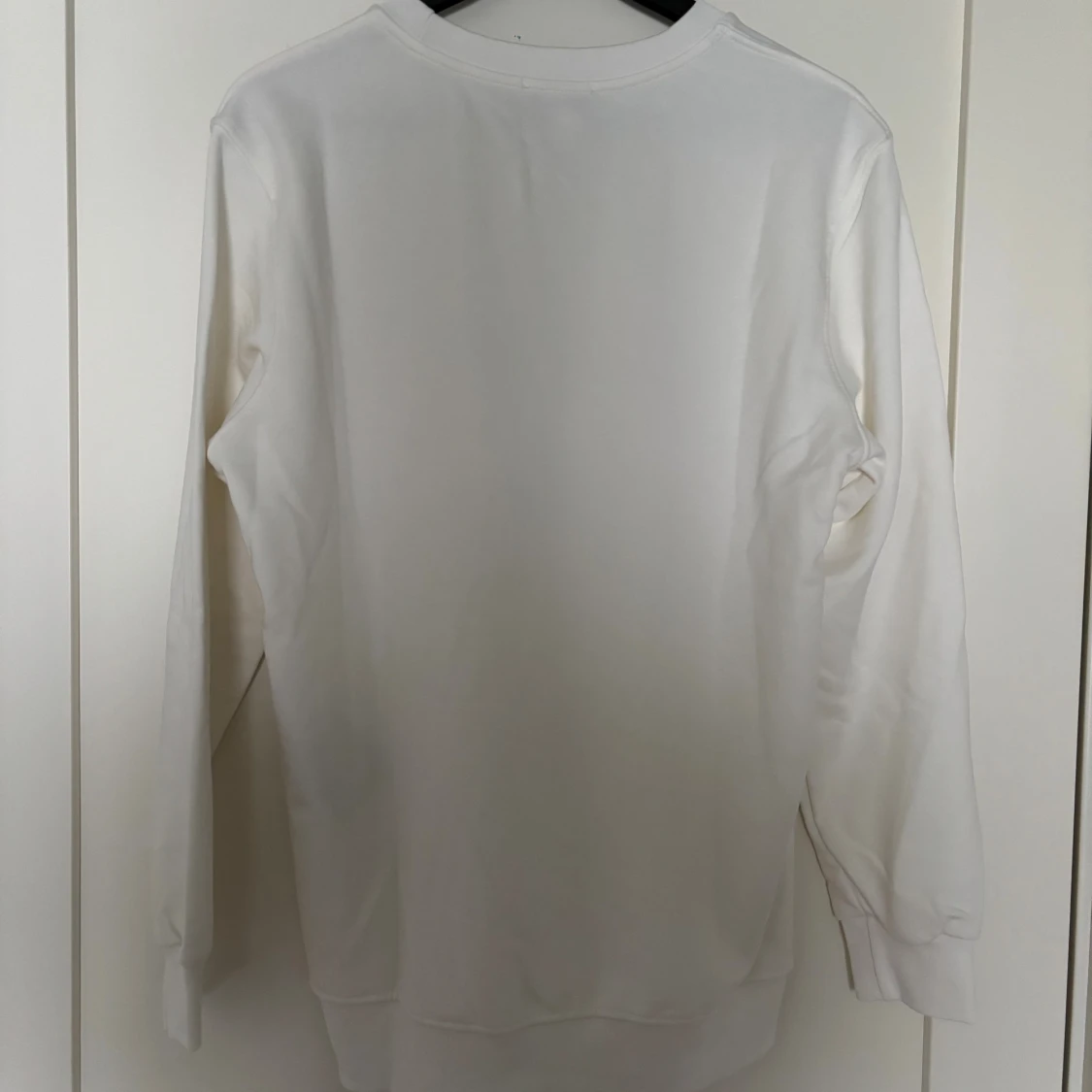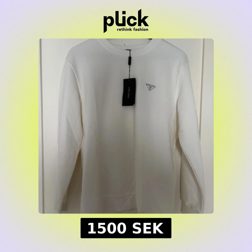 Säljer en stilren vit långärmad tröja från Prada med klassisk rund halsringning och diskret logotyp på bröstet. Tröjan är i mjuk bomull och har en clean look som passar perfekt till jeans eller dressade byxor.