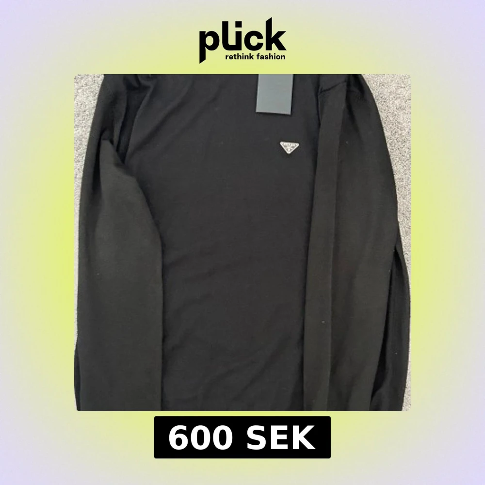 Svart stickad tröja från Prada med rund halsringning och diskret logga på bröstet. Tröjan har långa ärmar och ribbade muddar vid hals, ärmslut och nederkant. Perfekt för dig som gillar stilren och lyxig design.
