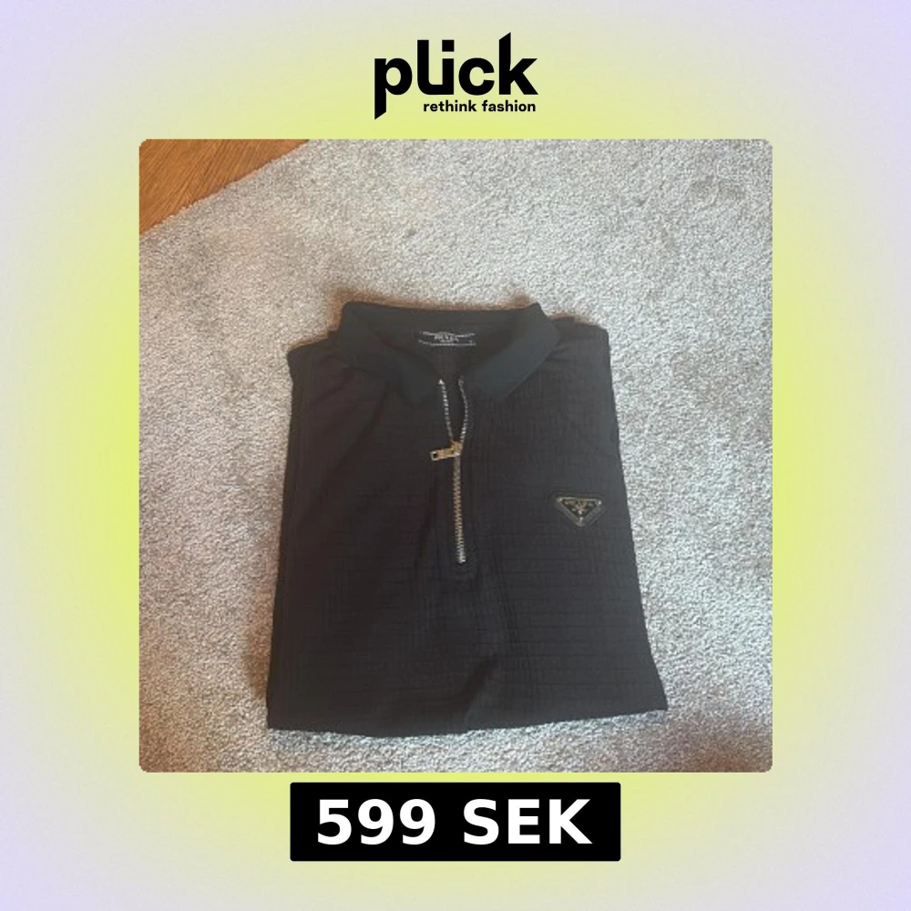 Svart pikétröja från Prada med klassisk krage och halv dragkedja framtill. Tröjan har korta ärmar och diskret rutstruktur i tyget samt Pradas ikoniska metallogo på bröstet. Perfekt för dig som gillar stilrena och exklusiva plagg.